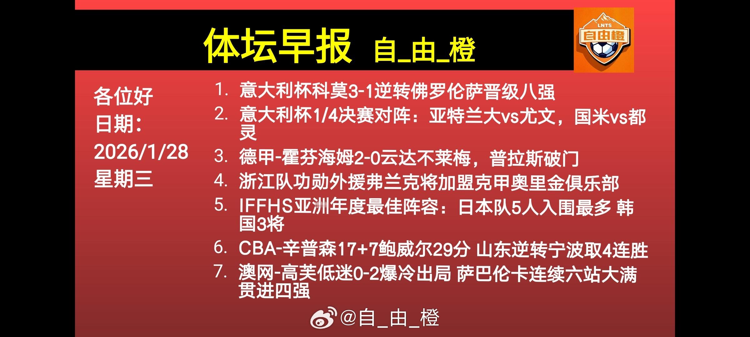 早上好自由橙体坛早报每日橙语