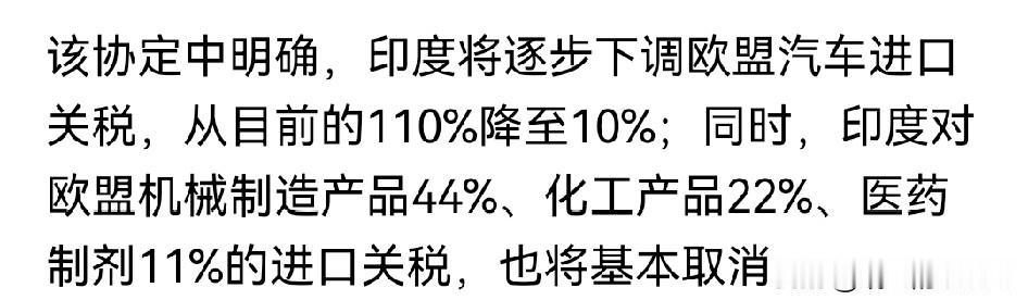 在印度做出重大让步后! 欧盟终于与印度签了贸易协议,双方笑得很开心…[捂脸] 印度想把东西卖给欧盟,欧盟也想把东西卖给印度。双方想的都挺好,就像当初美国也想把印度变成美国供应商和销售市场一样,可结果呢… 缔造一个拥有庞大中产阶级,消费需求旺盛并成熟的市场需要的不止是一纸自由贸易协议还需要时间,更重要的是天时地利人和。 它还需要一两代人通过不断的努力与奋斗为后代打下良好的基础。 比如印度的缺陷之一; 已经固化呈金字塔型的教育体系大量的民众是文盲少量的精英又没意愿建设印度而是往国外跑。这怎么能行呢? 朋友们,你们对此事怎么看? 欢迎大家在评论区探讨,留言…[送心]