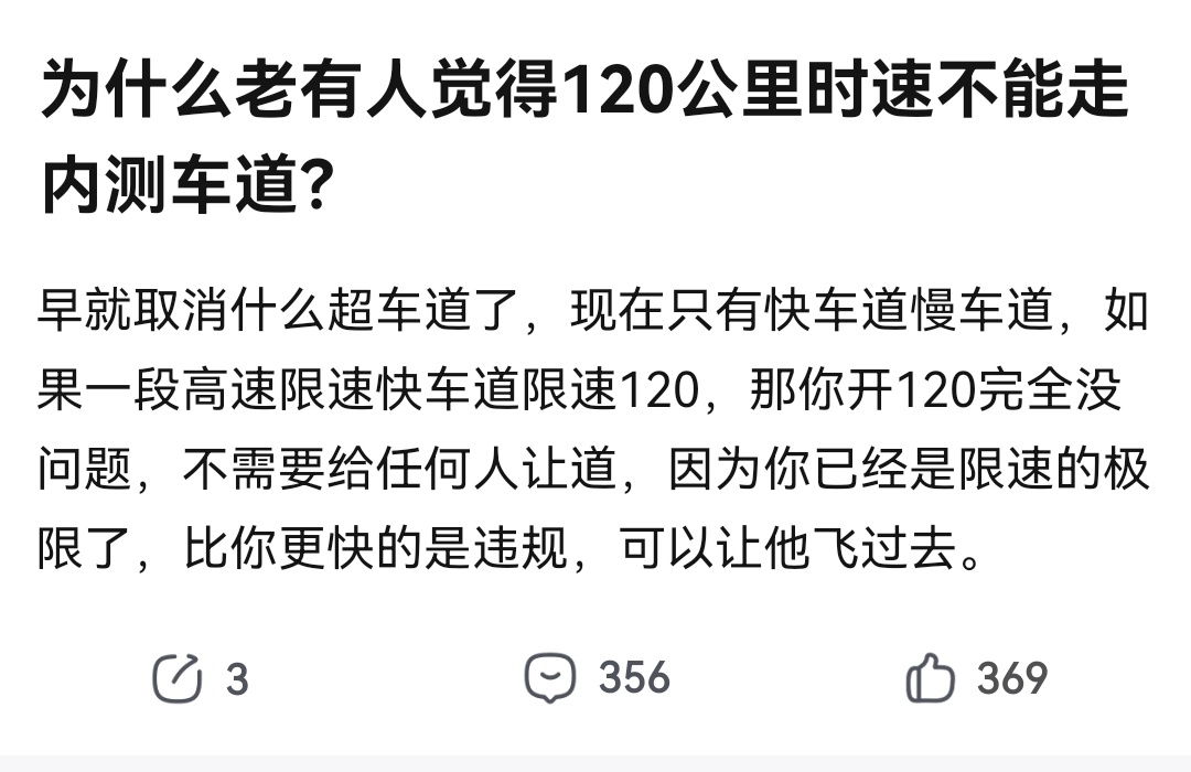 高速限速一般都是120km/h,这个速度跑在内侧车道没问题吧,毕竟再超就超速了。