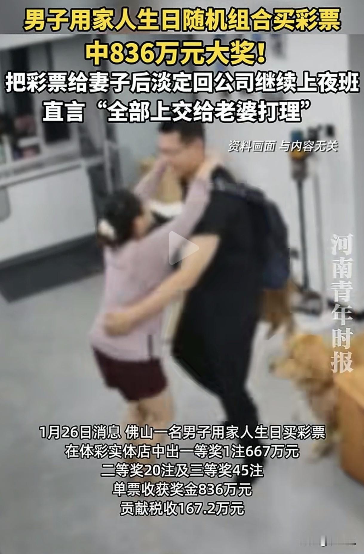 对老婆好的人,注定会发大财。这不佛山一男子用家人的生日买彩票,中了836万大奖,扣完税还剩600多万。结果他的做法更绝,直接把彩票给妻子,然后淡定上班,说了一句话,特男人,全部上交给老婆打理。 有人怀疑真实性,我觉得是真的。买的人那么多,总会有几个中的。不知道什么时候轮到你呢?