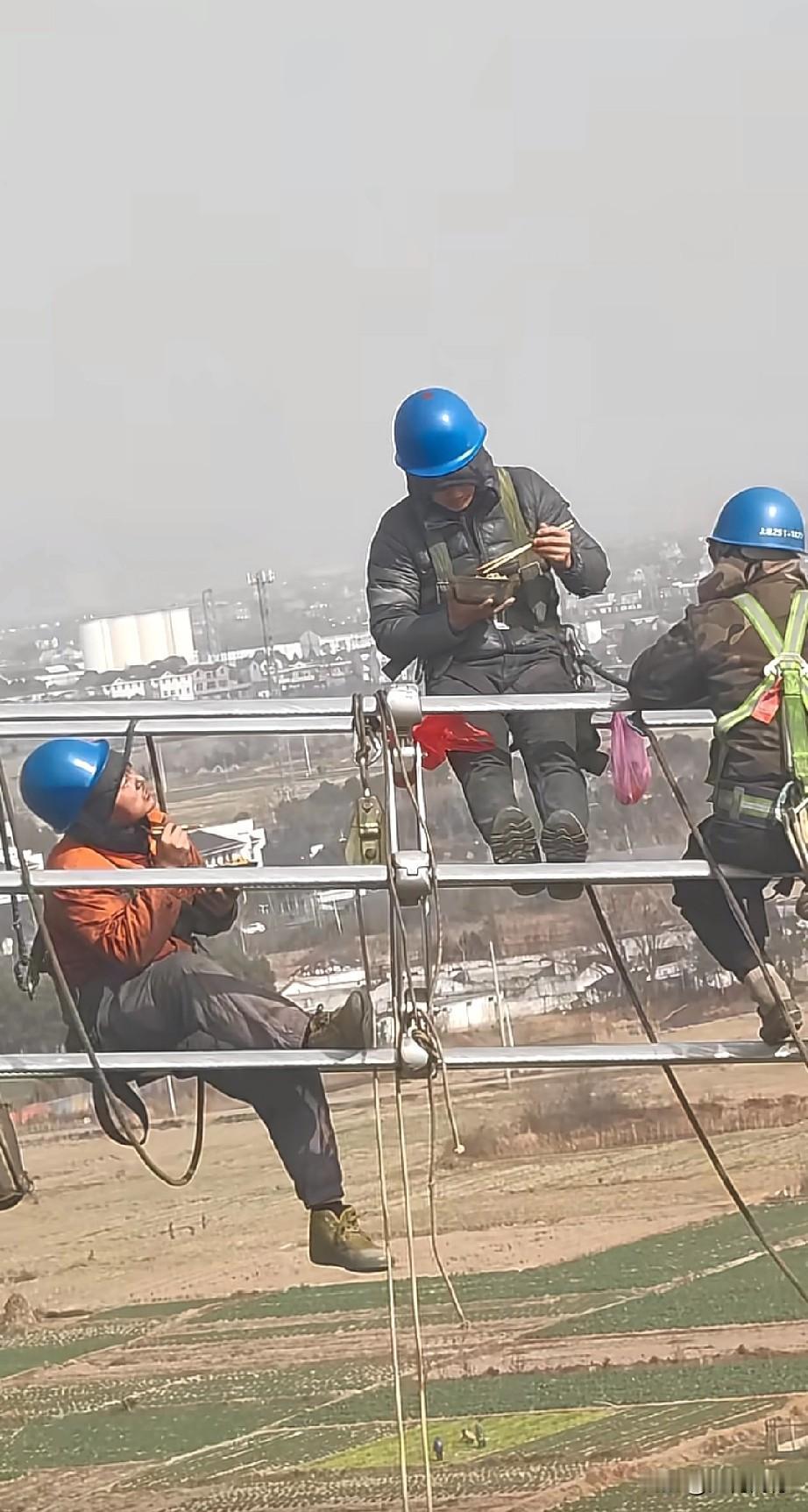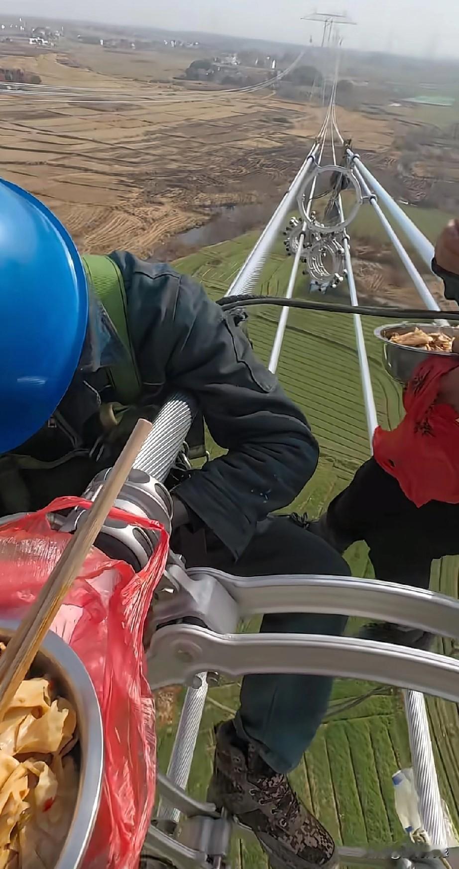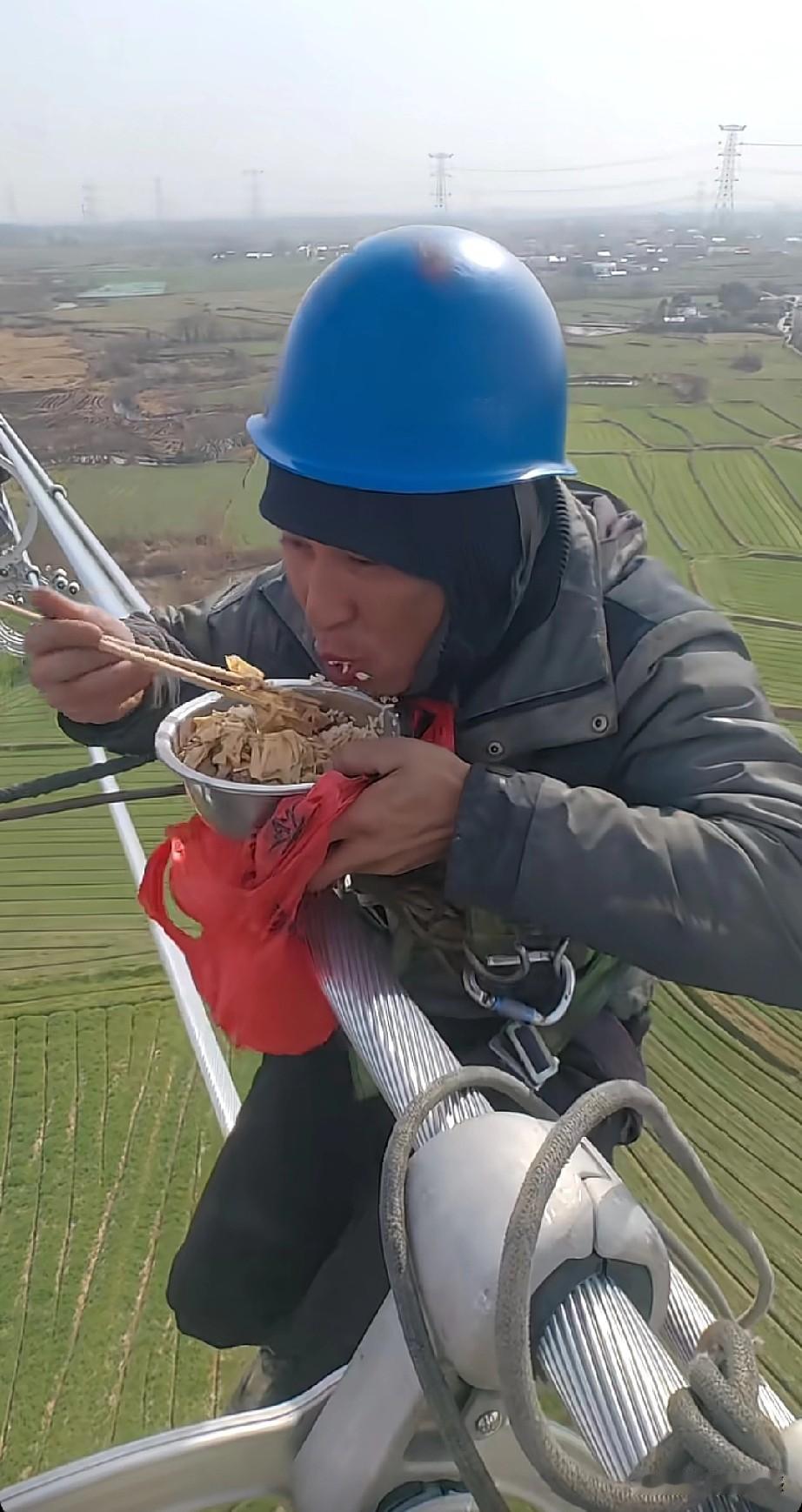 这些在高空作业的施工人员,真是够辛苦的了,为了保证施工,不耽误工程进度,他们在吃饭的时候,直接就在高空上吃了,整个身体用绳索固定在高空中,看起来非常的惊险,也非常的让人感动,这是最美的劳动者,这是最可爱的劳动者,向他们致敬,为他们点赞!
