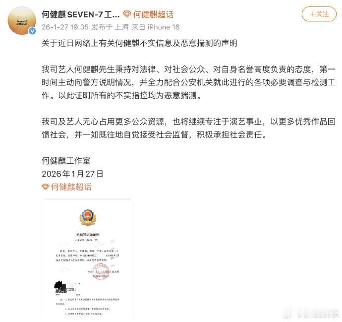 短剧顶流何健麒近日遭前女友举报吸毒,终于在昨晚工作室进行了无犯罪记录的回复。 而
