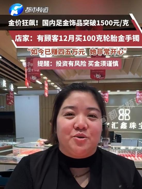 女子买100克黄金轮胎手镯赚4万多 看着金价这样涨,心里乐开花了吧