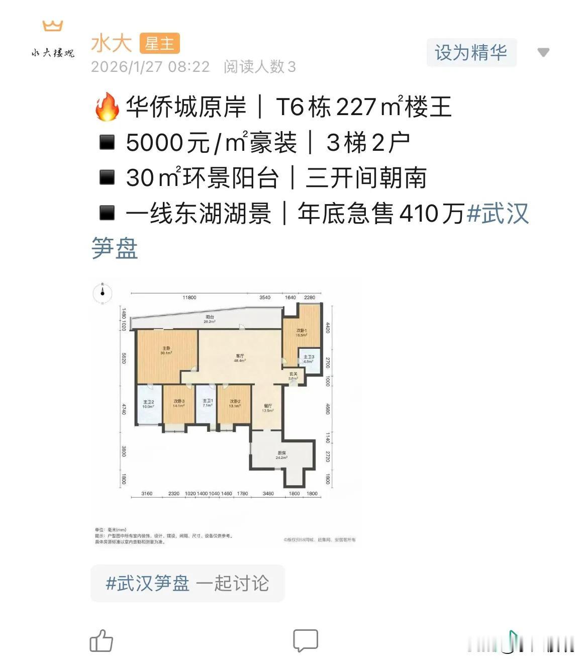 今日美居 华侨城大平层,虽然大,但是算起来得房率,却非常的一般,但是好在有200多平,再大的公摊,也应该够用了。从700多万到410万,它已经凤凰涅槃! 房价已经止跌回稳,各位不要错判形势,该买就要买,中国经济前景无限,中国房地产目前健康水平空前,具有极大的购买价值,有需要的,不要犹豫,马上买!
