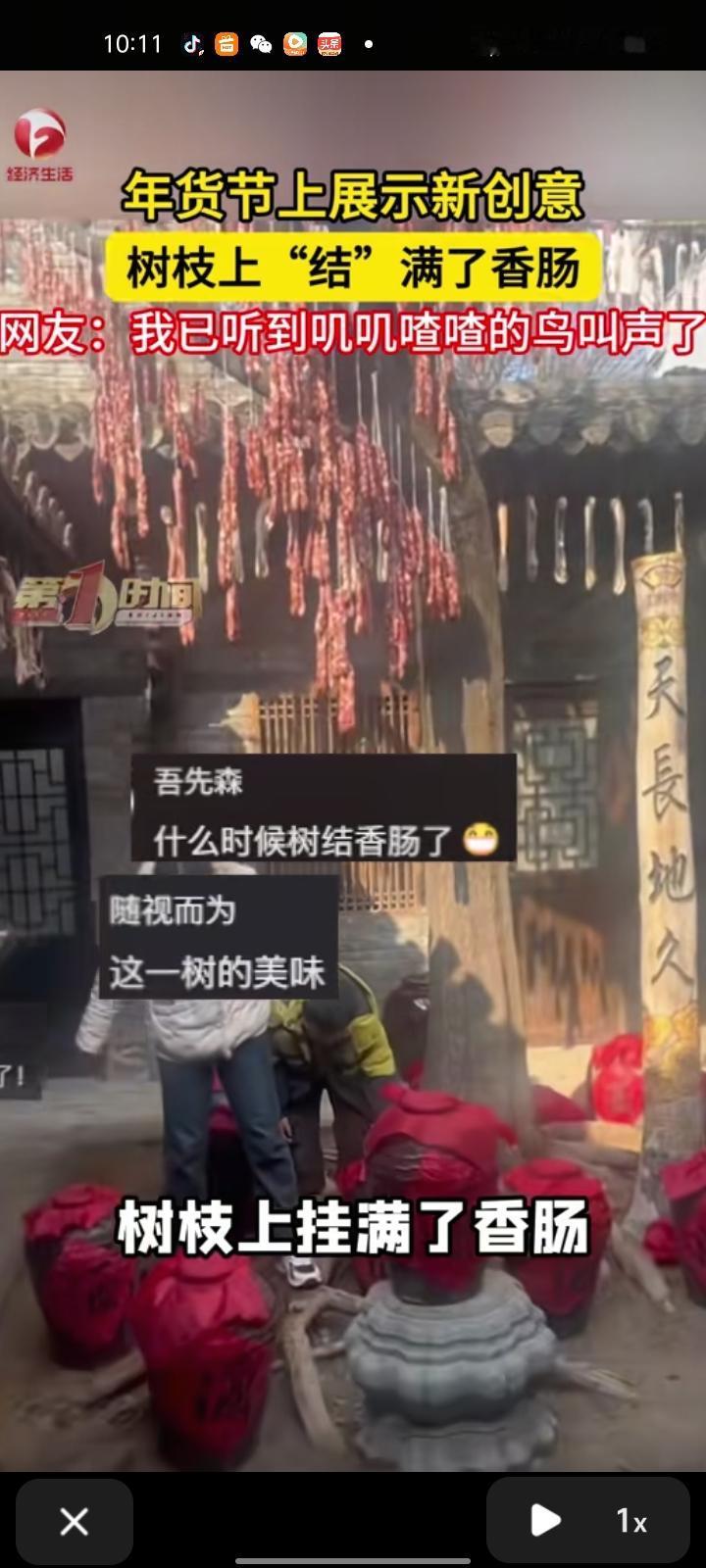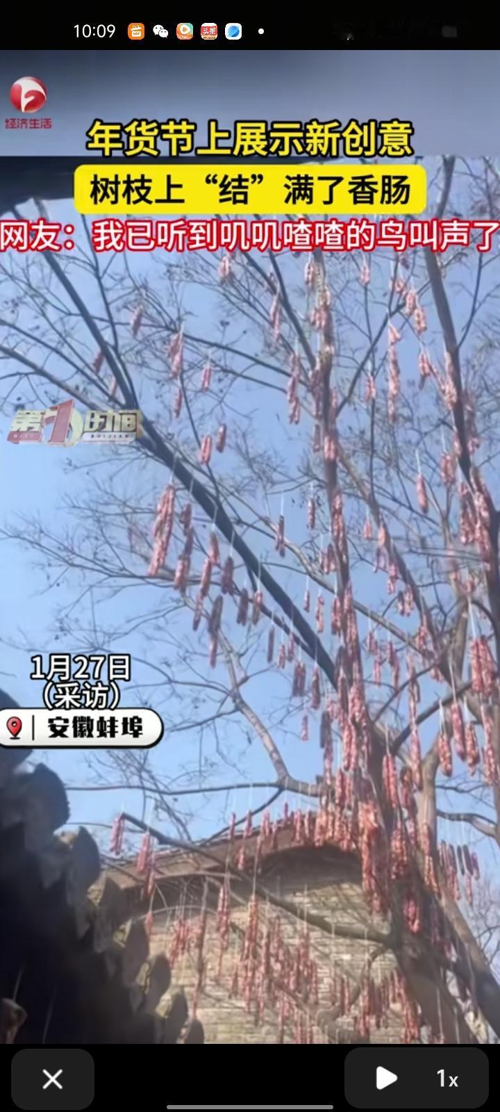 1月24日,安徽蚌埠。网友分享一段视频,蚌埠卫食园正在举办年货节,到处都是展出的年货,园里有棵特别的树,树上“结”满了香肠,看着特别震撼,确实很有创意。有网友在评论区称,我已经听到叽叽喳喳的鸟叫声了。