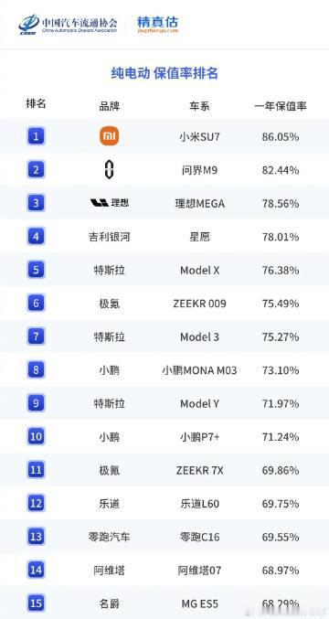 小米SU7开一年就卖,保值率居然高达86.05%排名第2和第3的分别是问界M9和理想MEGA,一年保值率也都在80%左右。【来自懂车帝车友圈】