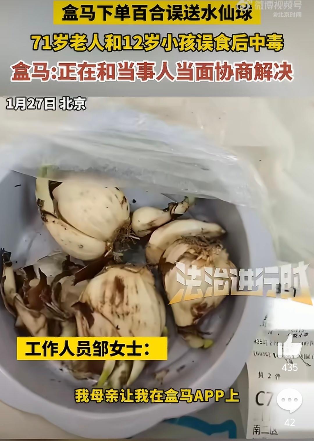 盒马误送有毒水仙球致老人孩子中毒下单食用百合,错送成水仙球。。这个就离了大谱这两个东西摆放的位置就不一样吧外形也不像啊盒马这管理 也是够乱的。。