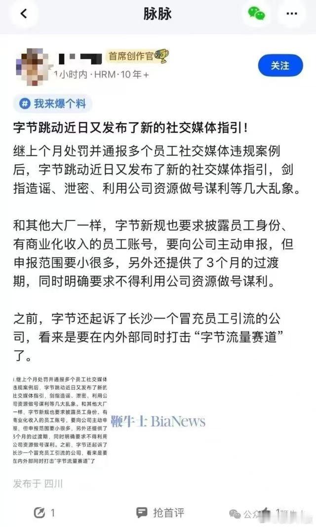 【字节禁止员工做号变现】字节发布新社交媒体规定据鞭牛士,近日,消息称字节跳动发布