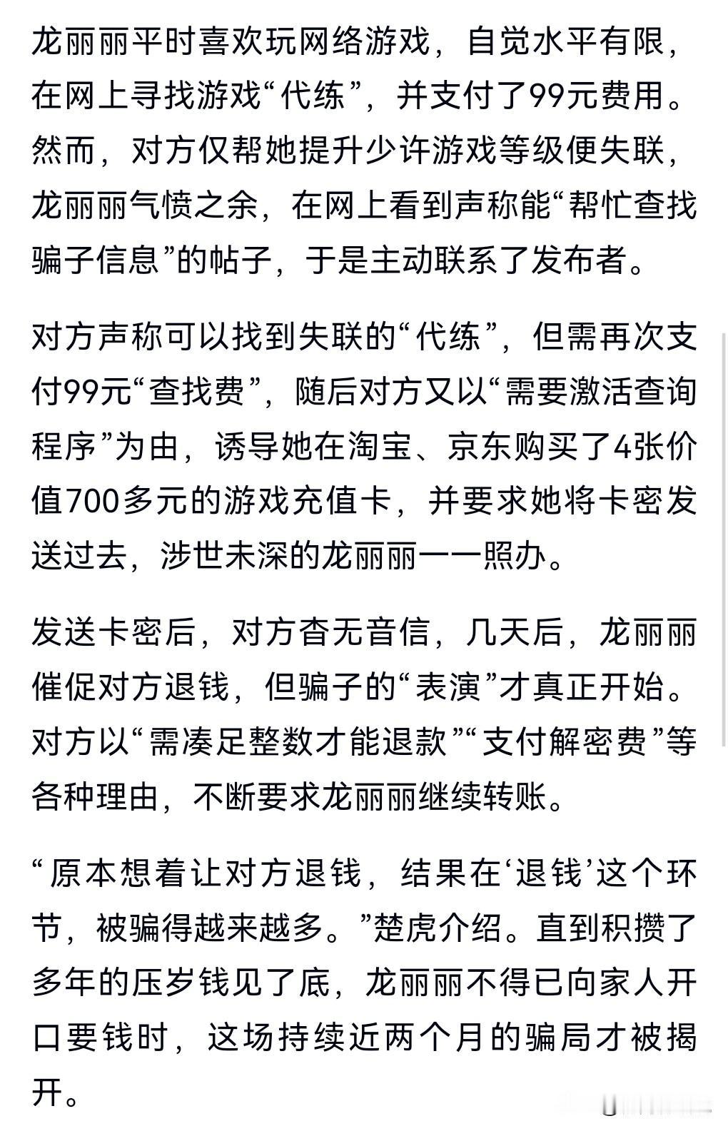 这真的是让人不知说什么好了,太容易上当受骗了。 转钱的时候一定要多想想,特别是大数额的。 这真的是很离谱啊!这么容易上当受骗。 1月27日热搜,大学生找游戏代练被骗99元,为找骗子又被别的骗子骗近12万。 打个游戏竟然还找代练,有必要吗?一个娱乐而已。 不过最终警方也是抓获了犯罪嫌疑人,追回了钱。 一定要严惩这些骗子。
