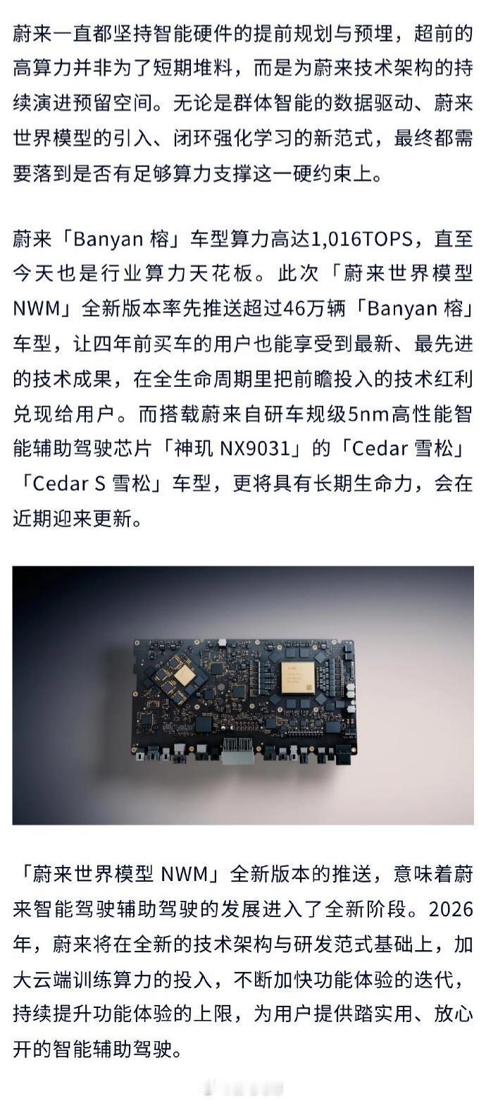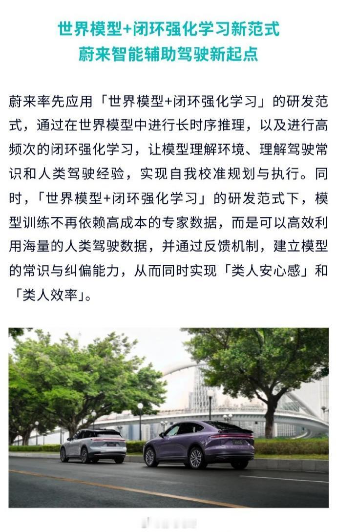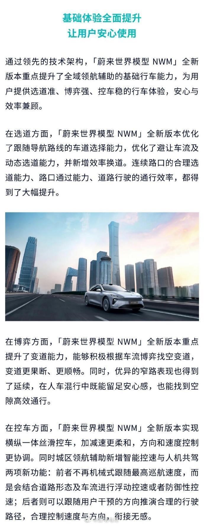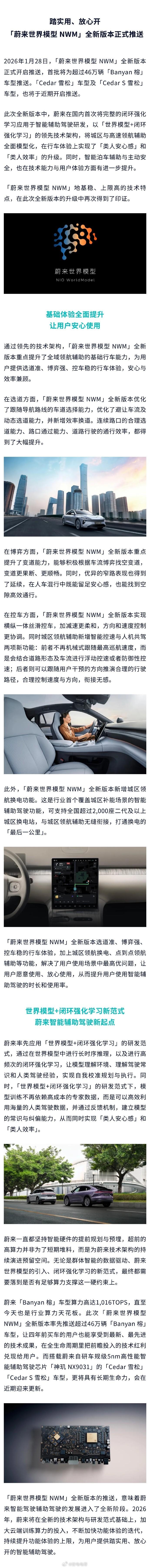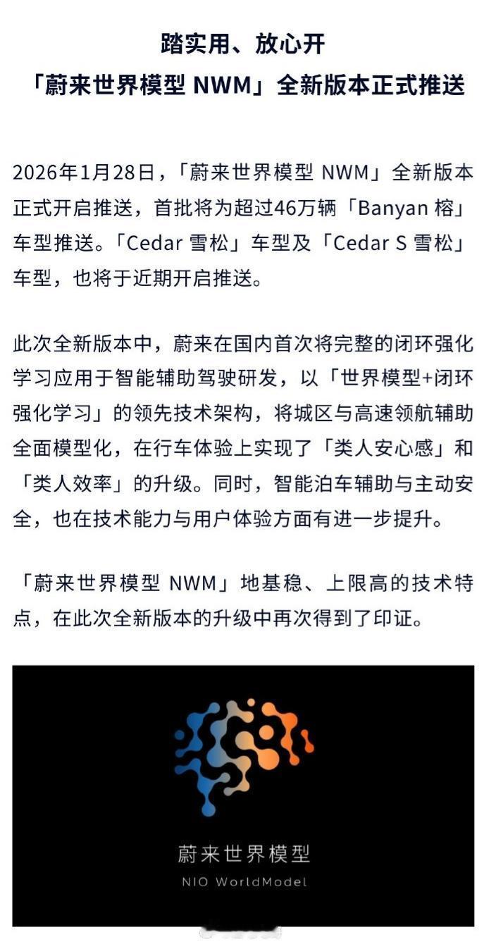 「蔚来世界模型 NWM」全新版本正式开启推送首批就会为超过46万辆“Banyan榕”车型推送,其他“Cedar雪松”“CedarS雪松”车型还要再等一等,不过近期也会开始推送。这次新版本中最特别的就是「世界模型+闭环强化学习」技术架构,这些技术表现在智驾上就是升级为选道准、博弈强、控车稳。同时城区领航辅助新增智能控速与人机共驾两项新功能总结一下,这次蔚来世界模型NWM版本升级后,智驾用起来将不再是“死板的机械感”,而是开始变得“类人”,人机共驾的感觉会变得舒缓很多。蔚来banyan新版升级蔚来世界模型来了