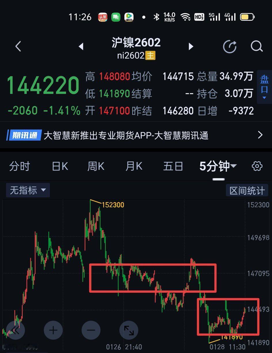 沪镍2602,今早的文章有一个很大的bug。在由141890开启的五分钟一笔上还不能确认完成的情况下,极早确定了围绕一分钟中枢三卖点的形成。仍旧是主观意识作祟 。其他内容仍为客观表达。目前走势结构可暂看做第二个一分钟中枢的构建,下午至夜盘时段要防止152300开始的三十分钟一笔下结束。次级别上可用一买或二买点参与三十分钟一笔上的反弹。