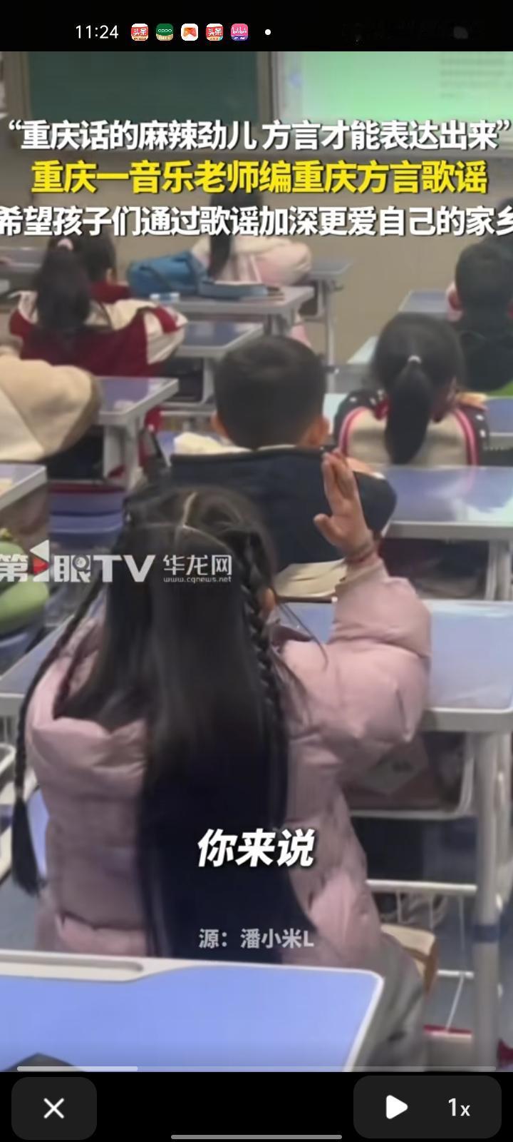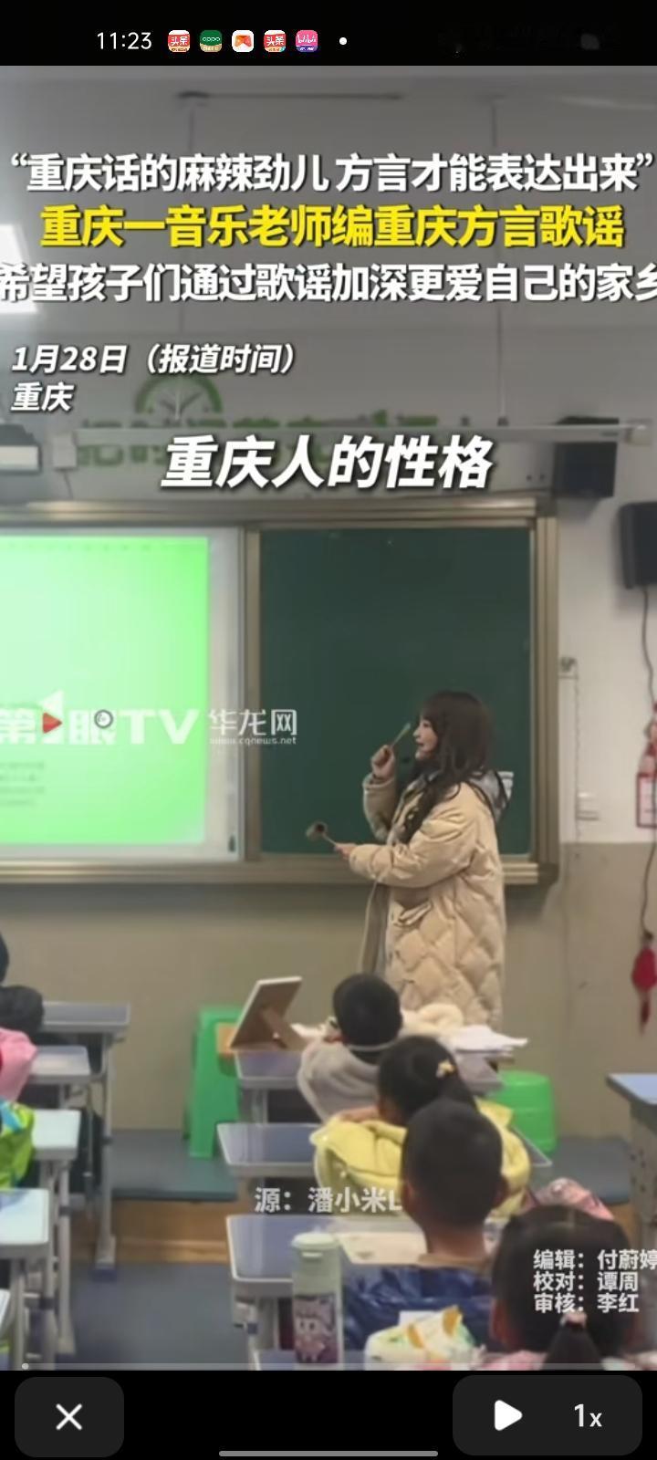 1月24日,重庆。音乐老师编重庆方言歌谣,希望孩子们通过歌谣深爱自己的家乡。当事老师称,这个词是在一个网页上看到的,感觉很有重庆的味道,就把它创编成一首歌谣,让孩子们用重庆话唱出来。用方言编重庆歌谣够地道有魂,更贴近重庆人的生活,方言自带烟火气,麻辣劲、直爽感在书面语表达不出来,歌谣更有辨识度,能戳本地人的共鸣。