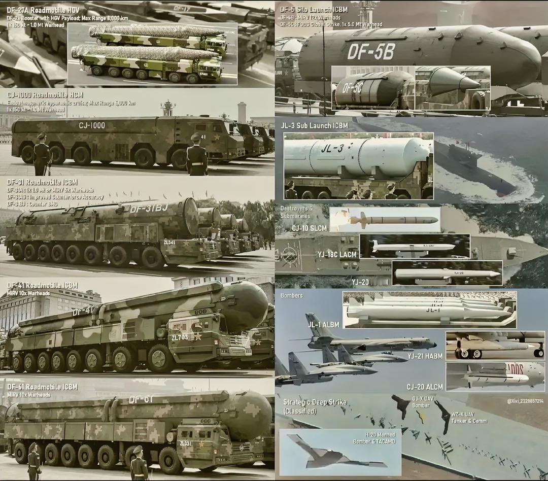 这是外媒做的中国战略力量的汇总,基本上都是我们现役的最新型号的导弹。左边最上面第一个是东风-27A,采用乘波体弹头,在临近空间飞行速度能达到8马赫,射程最大8000公里。这款导弹可是核常兼备的,可以自由切换。 下面第二个是长剑-1000,最大射程6000公里,具备自动变轨的能力。 第三个是东风31系列,31A是31的改进型,射程在10000公里以上。AG是31A的改进型,有分导式多弹头。BJ是31B的井基型,采用发射井模式,井发射的导弹可以做的更大一些。 第四个是东风-41,拥有10个分弹头,射程应该达到了15000公里,最高速度25马赫。 最下面是东风-61,看外形和41差不多,既然叫61,而不是叫41改进型,那就是做了重大升级的,至于哪里升级了,现在还不知道。 右边上面第一个是东风5系列,包括升级的B和C,尤其是东风5C,打击全球,那射程至少20000公里,地球周长的一半。 第二个是巨浪3,由核潜艇发射,预估射程在12000公里以上。 下面的还有惊雷1,是空基发射的型号,载具就是“六爷”,准确来说是轰6N,惊雷1的服役终于补齐了中国三位一体的核打击力量。 剩下的就是大家经常熟悉的长剑系列和鹰击系列,以及各种无人机。