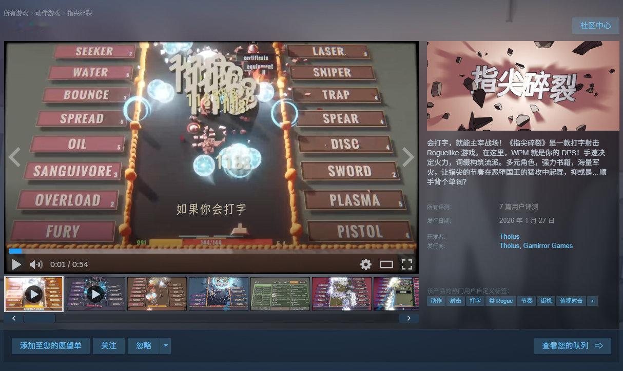 打字射击肉鸽游戏《指尖碎裂》已登陆Steam,首发优惠折后28.8元,支持中文,商店页面有免费试玩Demo。你的打字速度直接决定了火力密度。本作拥有数十种元素组合,比如输入WATER (水) 为子弹附魔水流,若再与FLAME (火) 烈焰相遇,就能瞬间触发「蒸发反应」,快速清屏。每位角色都拥有独一无二的天赋技能,你可以自由搭配功能各异的书籍与武器,打造独特的玩法流派。