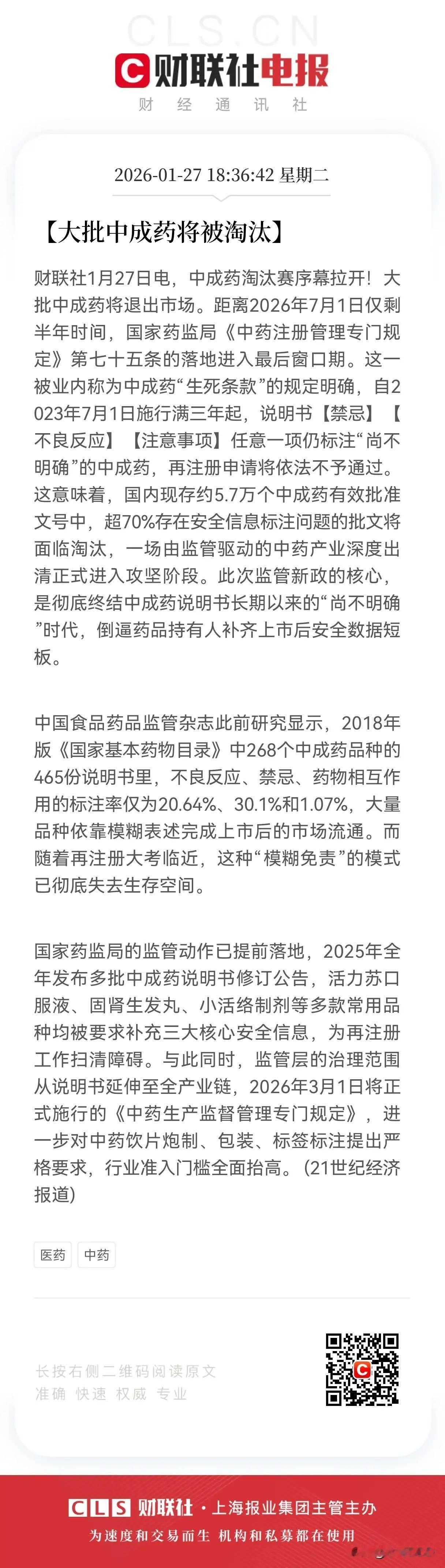 绞杀“尚不明确”:4万中药批文大限将至,一场迟到的“文字狱”正清算半个世纪的集体装睡 · 中药说明书上的“尚不明确”,曾是药企护身符、医患博弈免责金牌,更是行业对科学精神集体装睡的铁证。它如毛玻璃,让患者、企业、监管各安其位。但2026年7月1日,国家药监局规定,说明书禁忌、不良反应、注意事项中任一项标“尚不明确”的中成药,再注册申请不予通过。近4万个批文倒计时,2400家企业站在悬崖边,中药“大考”无退路。 一、70%的“裸奔”批文:行业集体露怯 2018年版《国家基本药物目录》显示,268个中成药品种的465份说明书中,不良反应标注率仅20.64%,禁忌标注率30.1%,药物相互作用标注率低至1.07%。患者询问副作用,医生只能说“尚不明确”。 这种“裸奔”状态持续数十年。某药企质量总监称牛黄解毒片卖30年,不良反应栏仅四字,医院却未停货。背后潜规则是:中药“辨证施治”个体差异大,不良反应难标准化;经典名方有“豁免权”;不写明就不存在。但2023年《中药注册管理专门规定》要求持有人开展上市后研究,修订说明书,逼行业睁眼。 二、“沉睡批文”的末日狂欢:僵尸药与ghost文的最后晚餐 5.7万个中成药批准文号中,大量是“僵尸状态”,多年未生产却占文号资源,政策松动就换包装上市。业内预测,若政策严格执行,到2028年可能60%文号消失。某省药监局数据显示,该省1200余个文号中,近五年实际生产不足40%。 “僵尸文号”持有者是政策套利高手,医保、基药目录调整时瓜分红利,创新药企却在文号审批中艰难跋涉。2026年大限是对行业的净化。 三、从“模糊免责”到“循证亮剑”:中药现代化的成人礼 “尚不明确”的终结是认知革命,中药产业要从“经验叙事”转向“数据叙事”。国家药监局早有布局,2025年以来多个品种说明书修订,2026年3月1日《中药生产监督管理专门规定》施行,全产业链监管加强。 但质疑声不断,老中医担心不良反应难标准化,企业主抱怨成本高。然而,中药要进医保、国际市场,就得接受科学scrutiny(审视),不能只享政策红利,拒绝现代监管。 四、全球棋局:中药国际化的“通行证”危机 这场“说明书革命”关乎中药全球话语权。WHO要求传统药物安全性数据可追溯、可评估,欧美对植物药审批重视说明书信息披露。 2023年中国中药出口额约50亿美元,但以药品身份进入欧美主流市场的屈指可数。“明星产品”多以膳食补充剂等形式出海,利润微薄,根源是说明书“尚不明确”。国家药监局强硬是为中药国际化“铺路”。 五、未竟之问:当“尚不明确”消失后,我们真正得到什么? 2026年7月1日后,中药说明书将改观,但形式合规未必带来实质安全。企业可能“乱写明”,让说明书成“免责清单”。 中药复杂性高,多靶点、多成分、配伍禁忌相互作用,“明确”不易。政策能逼企业交数据,却逼不出科学真理,制造“虚假明确”将是灾难。 这场“大考”不可逆转,它照出中药产业积弊,也是苦药。4万个批文经历生死劫,“尚不明确”成历史后,或许能有更干净的市场。中药说明书上的“尚不明确”,曾是行业胎记与伤疤,2026年大限不是终点,而是起点,对创新企业是机遇,对产业是涅槃之痛。毕竟,医学终极语言是“证据确凿”。 中药无效 药厂天书 新药批准 中药合法化 药监新规 药典手册 药典
