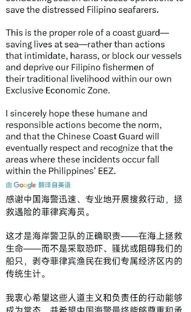 黄岩岛一场救援,把中菲矛盾推到台前。 1月25日下午,在黄岩岛海域,中方把此前救起的17名菲律宾船员和2具遗体,正式交给菲律宾海警,这批人原先都在一艘倾覆货轮上(船员共21人)。 参与搜救的是解放军南部战区和中国海警,舰艇在海面来回搜寻近两天,船员说“他们挂着绳子冲进冰冷海水”,这一幕和微博上的那些硬梆梆表态完全不是一个画风。 交接现场,有菲船员红着眼眶道谢,有人紧紧拥抱中国海警,还反复说“谢谢你们救了我们”,这种近距离接触,很难再用简单的敌我标签去解释。 画面刚落下,菲律宾海警发言人塔列拉却在社交平台连发多帖,先是阴阳怪气地提醒“中国海警本职是救人不是阻拦”,接着强调事发地点是所谓“菲律宾专属经济区”。 交接之后,他把火力打到舆论战上,一会说中方搞“网络水军”,一会指责中国在南海“恶意活动”,还扬言军方和海警“终会把中国赶走”,这更像是在对国内说明:海上救人归救人,政治立场不能软。 在菲律宾本国评论区,不少网民并不买账,有人讽刺他“连一只不会咬恩人的小狗都不如”,也有人提醒,真正的问题是本国海警在黄岩岛附近能否自己组织起足够的舰艇和预算,而不是天天盯着对方发言。 对这一幕,我更倾向把它看成一张切割线:一边是黄岩岛的战区现实——遇险就需要谁离得近谁来救;另一边是首都里的政策算计——军售、同盟、选举都压在南海议题上,你觉得接下来更可能改变的是海上的互助氛围,还是各自国内的舆论立场?