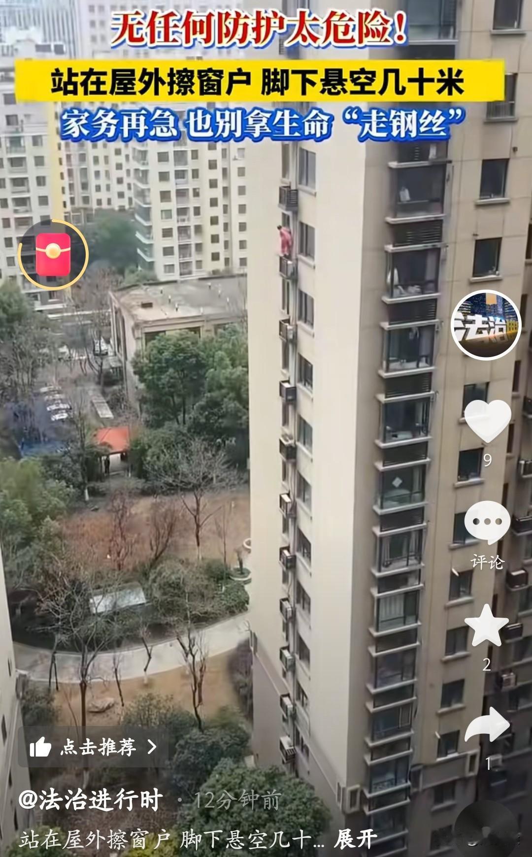 这位大姐是没搞清楚自己生命和玻璃干净的重要性!你看她就蹲在几十米高的外墙架子上,脚下是空的,手里拿着抹布擦玻璃,别说安全绳了,连个能扶稳的地方都没有,这哪是做家务,分明是拿命在走钢丝。 玻璃再脏,不擦能咋地?可要是脚下一滑,摔下去就是一辈子的事儿。家里人知道了得多揪心?就算自己不怕,也得想想孩子和老人。 现在高层擦窗的工具那么多,长杆擦窗器、磁吸玻璃擦,哪个不比爬出去安全?真犯不着为了这点家务,把自己置于险地。 这事儿也给所有人提个醒:家务再急,安全第一,千万别拿生命换干净。