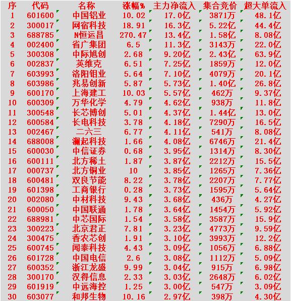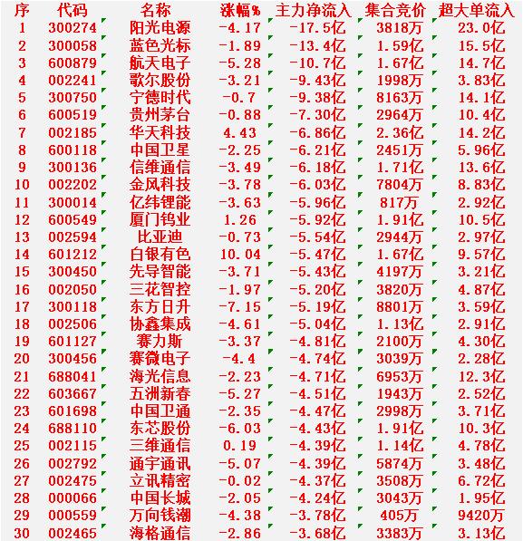 1月28日上午盘,主力趁低位,大幅买入的30名单 中国铝业:涨幅 +10.02%(涨停),净流入 17.0亿元 网宿科技:涨幅 +18.91%,净流入 16.3亿元 N恒运昌:涨幅 +270.47%,净流入 13.4亿元 省广集团:涨幅 +6.50%,净流入 11.3亿元 中际旭创:涨幅 +2.68%,净流入 9.20亿元 1月28日中午收盘,主力资金“大幅卖出”的30名单: 阳光电源:跌幅 -4.17%,净流入 -17.5亿元 蓝色光标:跌幅 -1.89%,净流入 -13.4亿元 航天电子:跌幅 -5.28%,净流入 -10.7亿元 歌尔股份:跌幅 -3.21%,净流入 -9.43亿元 宁德时代:跌幅 -0.70%,净流入 -9.38亿元