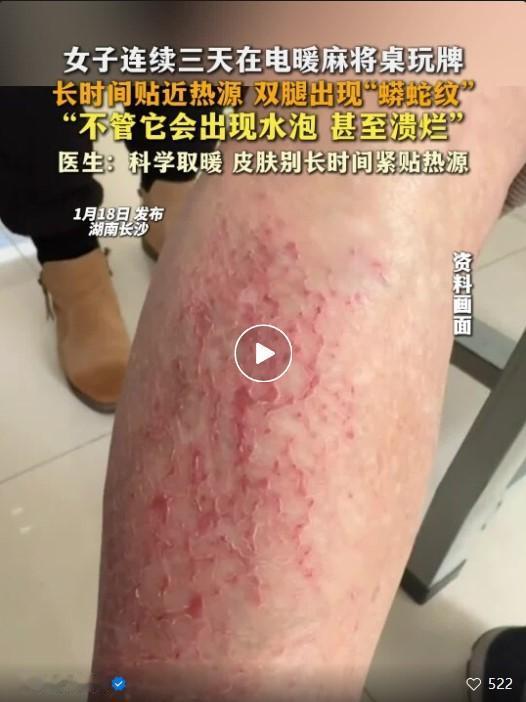 据湖南广播影视集团风芒新闻消息,近日,湖南长沙58岁的李华(化名)女士,和老同学在农家乐聚会时,连续三天围坐在电暖麻将桌前打麻将,回家后不久,双小腿就出现了暗红色网状斑纹,还伴有鳞屑脱落和刺痛感。察觉异常后,李女士立即前往长沙市中心医院皮肤科就诊,最终被确诊为物理性皮肤病“火激红斑”,罪魁祸首正是长时间接触电暖桌的持续热辐射。 该院皮肤科副主任医师刘雷山结合问诊情况解读,火激红斑并非明火烫伤所致,而是皮肤长期暴露在43℃至47℃的温和热源下引发的损伤,这种温度虽不会立即造成烫伤,却会慢慢破坏皮肤下的毛细血管网,进而出现特征性皮肤改变。李女士连续多日久坐电暖桌前,双腿长期贴近热源,正是诱发该病的核心原因。 据权威医学资料显示,火激红斑初期多为一过性网状红斑,随后颜色会逐渐加深为紫红、褐黑色,表面可能伴随鳞屑,常伴有刺痛、灼热或瘙痒感,好发于小腿、大腿、腹部等易贴近热源的部位。若未及时脱离热源,可能出现皮肤萎缩、水疱,长期反复刺激还可能增加皮肤角化增厚风险,极少数情况下甚至可能诱发癌变。 针对李女士的病情,医生给出治疗建议:核心是立即脱离热源,避免皮肤再受持续温热刺激,多数轻度患者远离热源后,皮损会逐渐自行淡化消退,同时可外用温和保湿霜修复皮肤屏障,缓解不适症状。 医生特别提醒,冬季取暖需求激增,使用电暖桌、取暖器、暖宝宝等设备时,切勿让同一部位皮肤长时间紧贴热源,单次接触最好不超过30分钟,保持“温热不烫”的安全距离;老年人、儿童、糖尿病患者等温度感知不敏感人群,更需格外注意取暖时长与方式,一旦发现皮肤出现不明网状红斑,且有热源接触史,应及时就医排查。