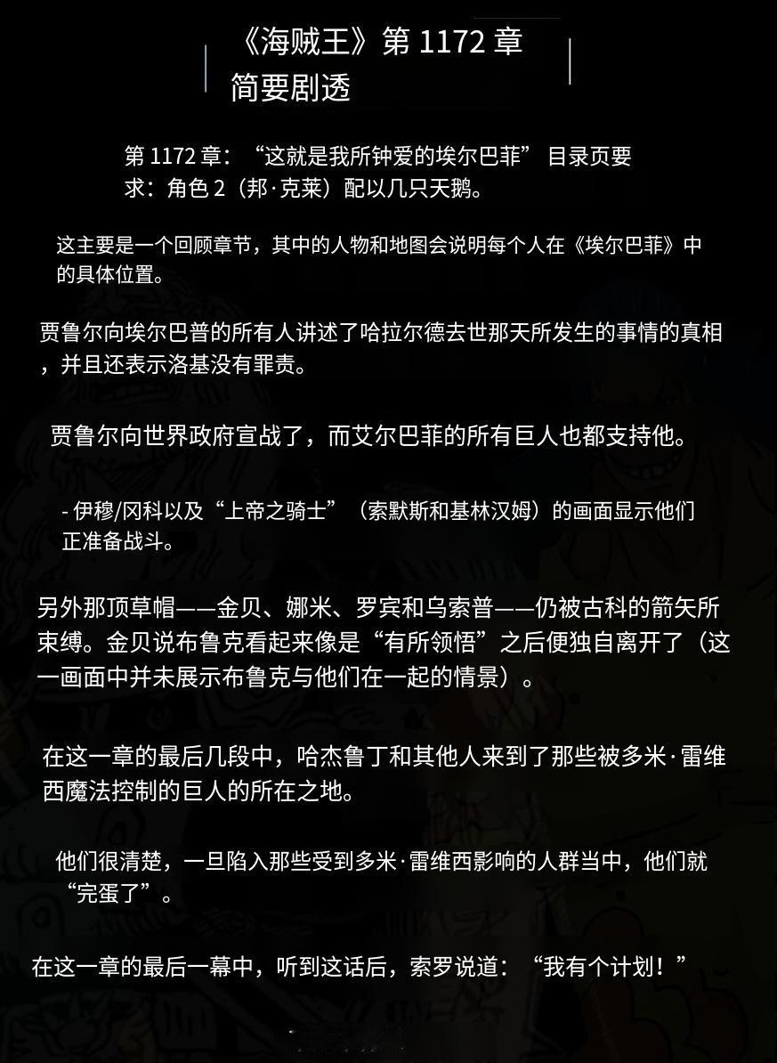没想到吧巨人国居然直接向世界政府宣战了!《海贼王》第 1172 话内容情报内容是:埃尔巴夫宣布开战声明 ! 第 1172 本章节名称是《这就是我所钟爱的埃尔巴菲》,其中描述了年长的巨人贾鲁尔为哈拉尔国王清除洛基王子的冤仇,并号召埃尔巴菲的所有巨人与伊穆及诸神骑士展开战斗。路飞、索隆等人也加入到与神骑士团的战斗直接对上了红鬼与蓝鬼,没想到第一个与世界政府开战的竟然不是革命军也不是海贼,居然是巨人国,那些在海军中的巨人中将是否会倒戈?感觉世界政府现在危险了,巨人倒戈、科学部队受到贝加庞克控制、海军中以卡普为首的也可能叛变。。。[白眼]