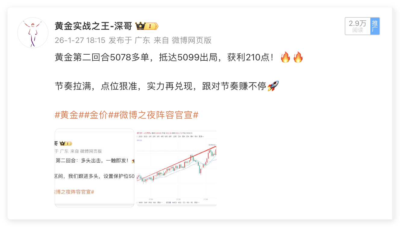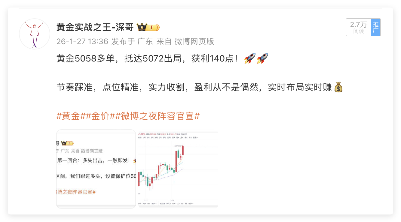 1月27日周二布局回顾:单日战绩370点🎯🎯黄金5058多单,抵达5072出局,获利140点黄金5078多单,抵达5099出局,获利210点黄金5083多单,抵达5073出局,损失100点黄金5070多单,抵达5082出局,获利120点四战稳收核心盈利!稳健盈利不空谈,单笔小损严格风控,专业把控盈亏比,不恋战不扛单,盈亏可控才是王道,深哥实力带队稳稳盈利,靠谱才是硬通货💰实战布局全程透明!🔥🔥🔥黄金金价科比大女儿发文缅怀