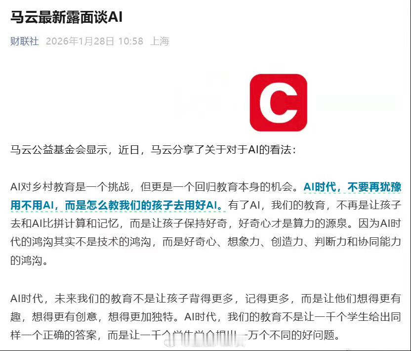 马云最新露面谈AI:AI时代,不要再犹豫用不用AI,而是怎么教我们的孩子去用好AI