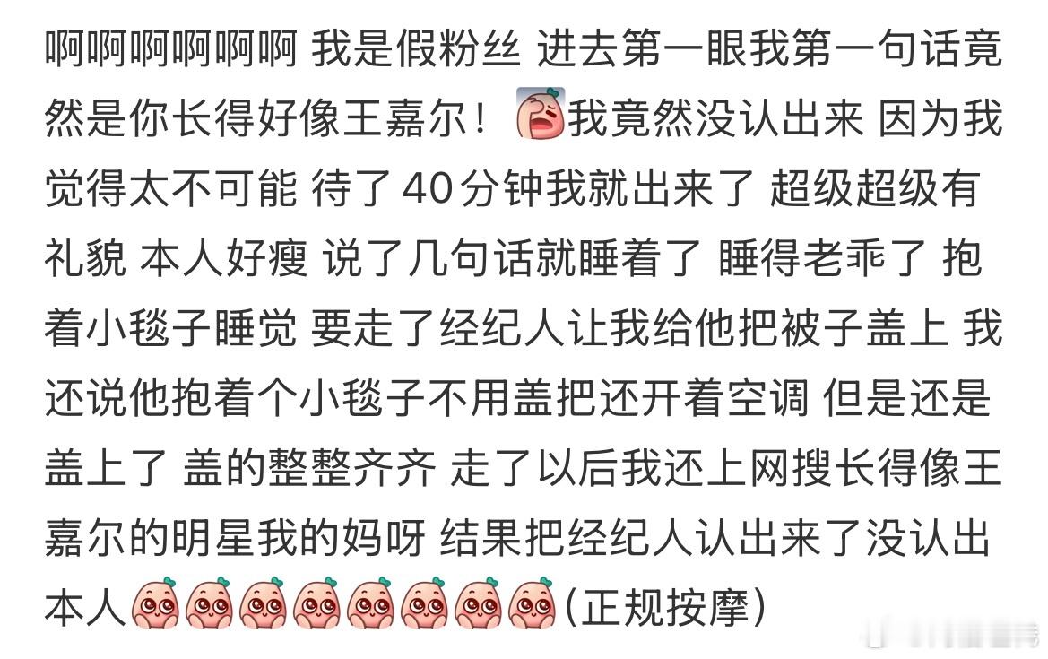 按摩按到王嘉尔了 我不得劲了,一睁眼让我看到这个!是哪位粉丝什么幸福!按摩按到了王嘉尔,听粉丝的描述都能感觉到她有多激动了,网友:找到就业方向了哈哈哈 2025微博之夜爆款创作大赛