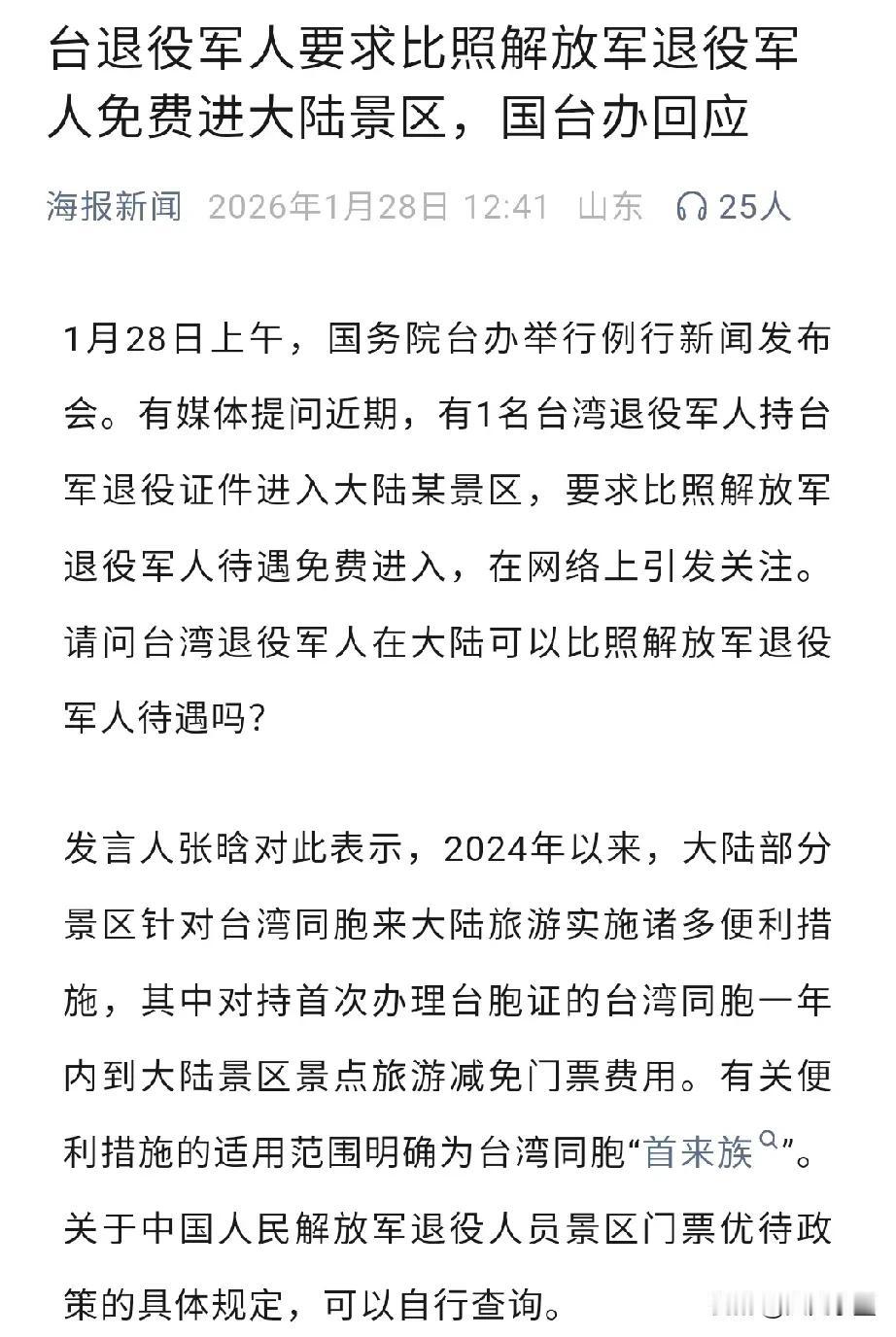 近日,一名台湾退役军人在某景区检票时,要求跟中国大陆退役军人享受同等待遇,理由是在地图上台湾属于中国的一部分! 近年来,中国已经有一些省市的景区对台湾退役军人是非常友好和包容的,让他们与大陆退役军人享受了同样的免门票待遇! 其实,一张门票不算什么,关键是台湾的退役军人是发自内心真正认为台湾是中国的一部分,承认自己是来自中国台湾的退役军人,这一立场比什么都重要! 希望他们不要在享受待遇时承认同根同源,而其他方面却背道而驰! 国家统一势在必得,也是两岸人民众望所归,愿这一天早日到来!