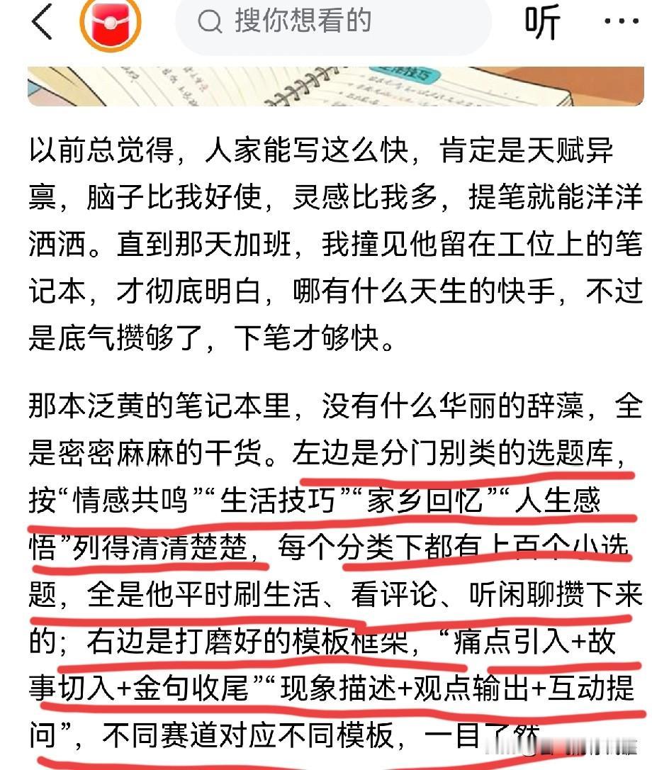为什么我写头条收益低?写头条这么久,没有选题库,没有写作框架,想到什么写什么,总体收益800多。今天看了一篇文章,忽然明白为什么我在头条没取到好的成绩。 今天看到一篇文章,称一位同仁,一天发了超过20篇微头条。 为什么能写这么多,因为他自己整理了一份非常强大的选题库,包括每个类型的选择的写作框架。 每天他都会花时间追热点,然后整理在自己的选题库里。 随便拿出一个选择,就可以写成一篇微头条,或是文章。 能做到这个程度,真的是花了心思。 我不知道这位同仁的收益怎么样,但他对待一件事情如此认真,一定能够快速起号,快速把账号做起来。 这个世界,优待的一定是对事情认真、坚持的人。 而不是想起来做点儿,三天打鱼两天晒网的人。 想要取得成绩,光靠运气完全不够,运气的背后还是实力的支撑,而实力哪里来? 尤其对于普通人,实力的来源就是深度研究,把一件事情做到极致。 我得向这位同仁学习,正是你们的优秀才让我看到自己的不足。