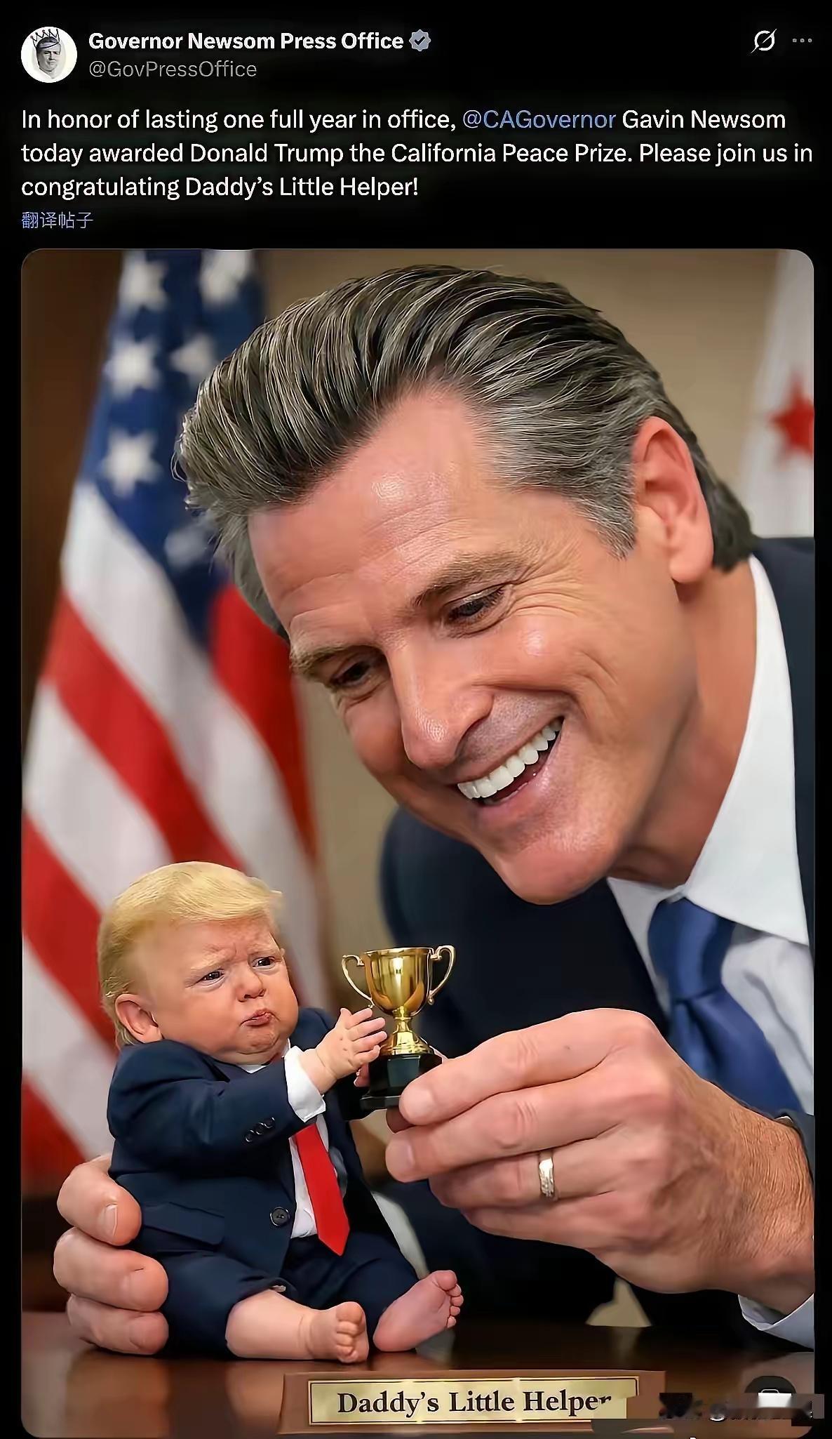 这张图片真的太有画面感了,把特朗普和纽森之间的微妙关系展现得淋漓尽致。特朗普想要诺贝尔和平奖却没得到,那一脸委屈的模样,还真像个闹脾气的老小孩。而纽森拿着个奖杯去哄他,感觉就是在调侃。 这两人梁子结下也不奇怪,政治场上本就竞争激烈。特朗普一直行事高调,野心勃勃,对奖项这种荣誉肯定很在意。纽森这么一嘲讽,估计特朗普心里得憋着火呢。说不定之后两人还会有更多明争暗斗,吃瓜群众就坐等后续好戏上演啦。
