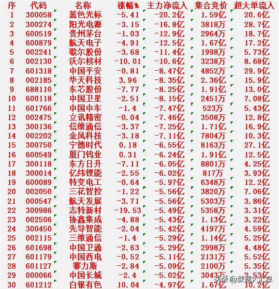1月28日尾盘30分钟,主力资金大幅卖出的30名单! 蓝色光标:净流入 -20.2亿元,集合竞价成交额 1.59亿元 阳光电源:净流入 -16.8亿元,集合竞价成交额 3818万元 贵州茅台:净流入 -12.9亿元,集合竞价成交额 2964万元 航天电子:净流入 -12.5亿元,集合竞价成交额 1.67亿元 歌尔股份:净流入 -11.4亿元,集合竞价成交额 1998万元 沃尔核材:净流入 -10.6亿元,集合竞价成交额 3238万元