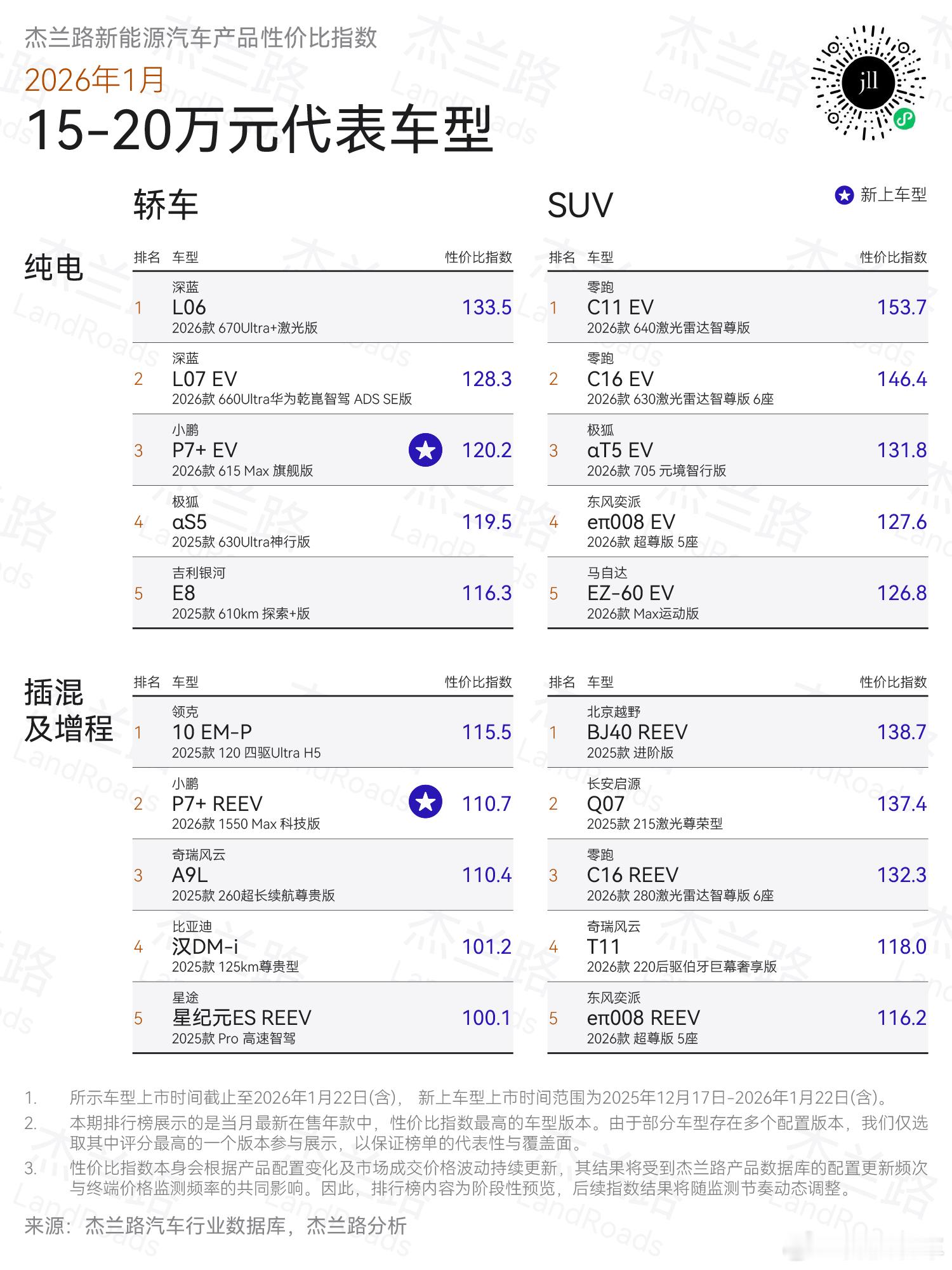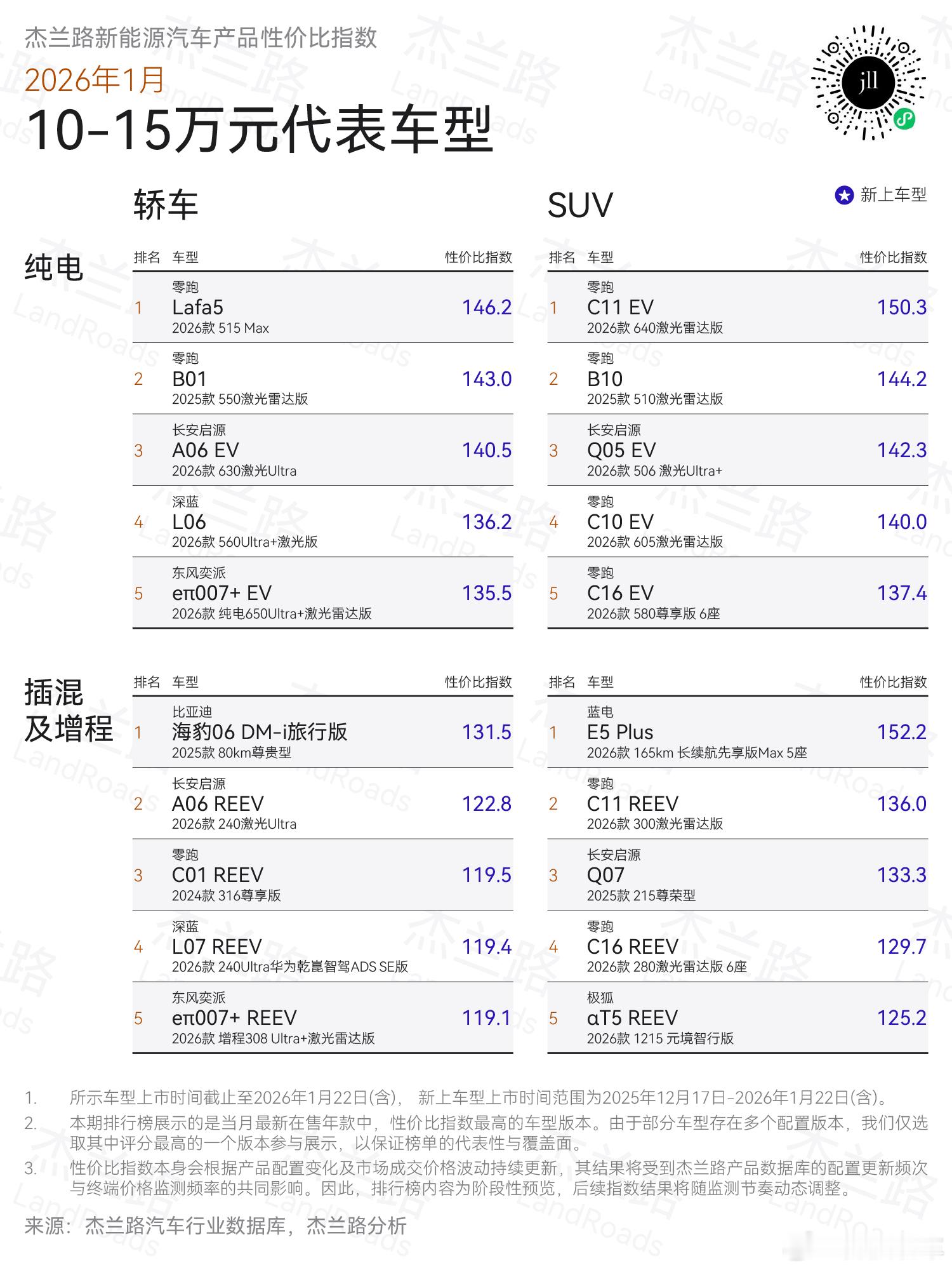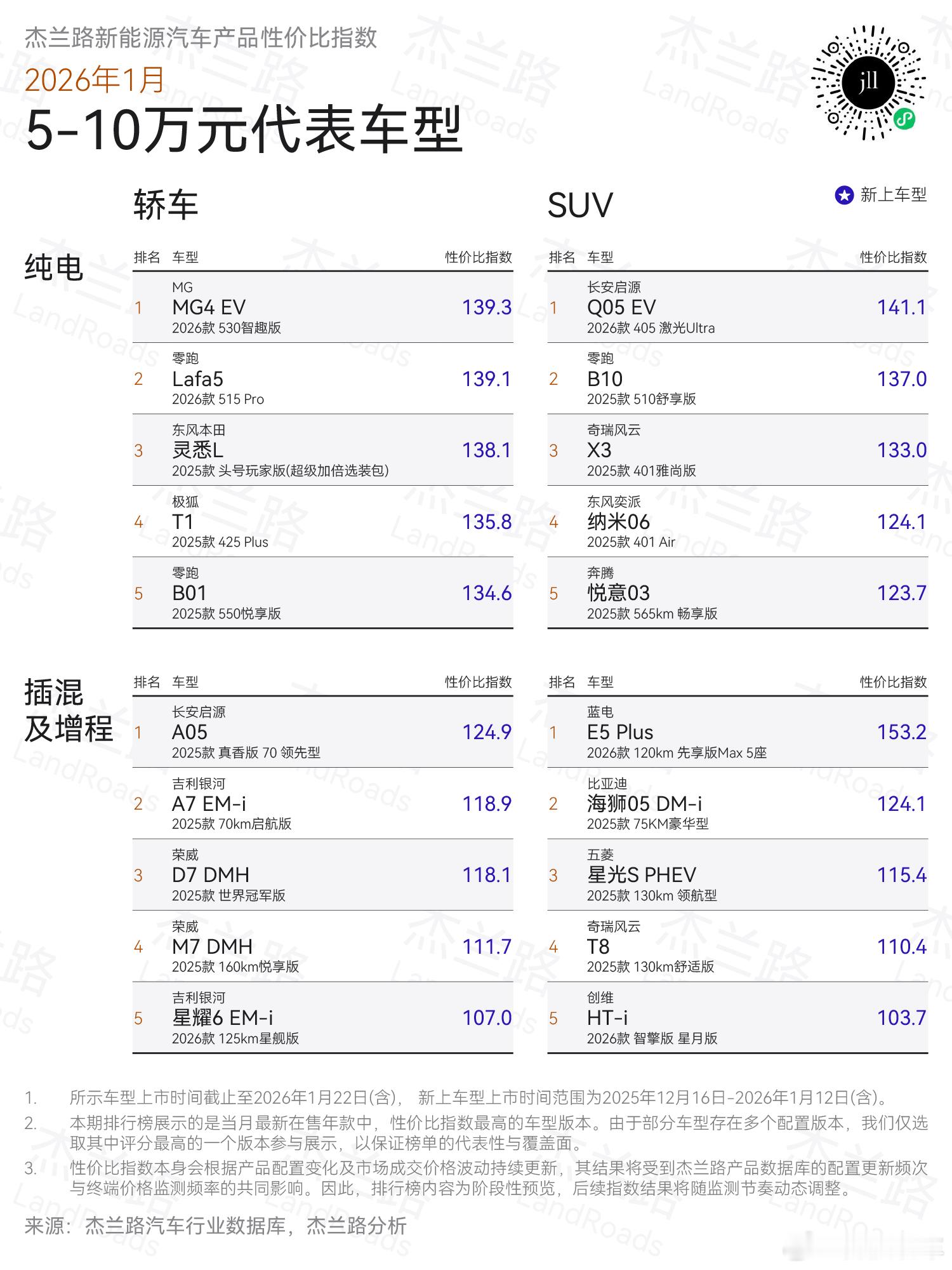杰兰路统计的新能源汽车产品性价比指数,涵盖5万-25万这个价位,这个价位也是大家最关注,够得着的价位。分别列举了纯电、插混和增程的轿车和SUV,马上过年了,想买新能源车的朋友,可以多看看这个榜单作为参考。