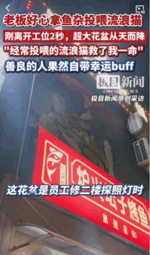 “解释不清了”。烤鱼店老板拿着鱼杂投喂流浪猫,他起身离开2秒钟后一个大花盆从天而降,不偏不倚正好砸在他的座位上。 这惊险一幕发生在1月27号贵州一烤鱼店里。花盆就砸下来时伴随着巨大的响声,老板被吓了一跳,手里拿着的鱼杂也忘了给流浪猫吃了,他转身看到花盆掉落的位置,身上顿时吓了一身冷汗。 据老板介绍,他投喂的这只流浪猫大约一个月之前出现在他的店门口,当时他看到这只流浪猫饿着肚子,就随手把旁边的鱼杂喂给它吃。从此,这只小猫就经常来“光顾”他的店,而每次来,老板都会投喂它一些吃的。 老板说,这次如果没有这只猫的出现,此刻他已经被砸的躺在地上了。 而那个掉落的花盆也不是高空抛物,而是自家的花盆。当时,有员工在二楼修探照灯时,不小心碰掉的放在阳台上的这个十几斤重的花盆。 这真的是你管我饭,我救你命。 正如网友所说的那样,善良的人是自带幸运buff的!