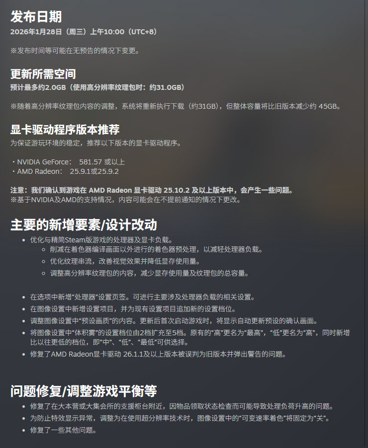 卡普空为PC版《怪物猎人荒野》推出了新的优化更新,内容包含优化与精简Steam版游戏的处理器及显卡负载、新增可调整处理器负载的相关设置和扩充“体积雾”设置档位等。