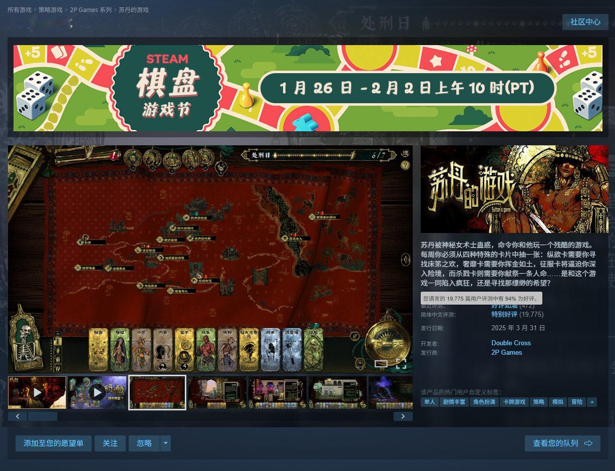 叙事驱动卡牌生存RPG《苏丹的游戏》已通过Steam Deck验证。本作目前在Steam上的国区好评率为94%,收录超19000篇玩家评测。