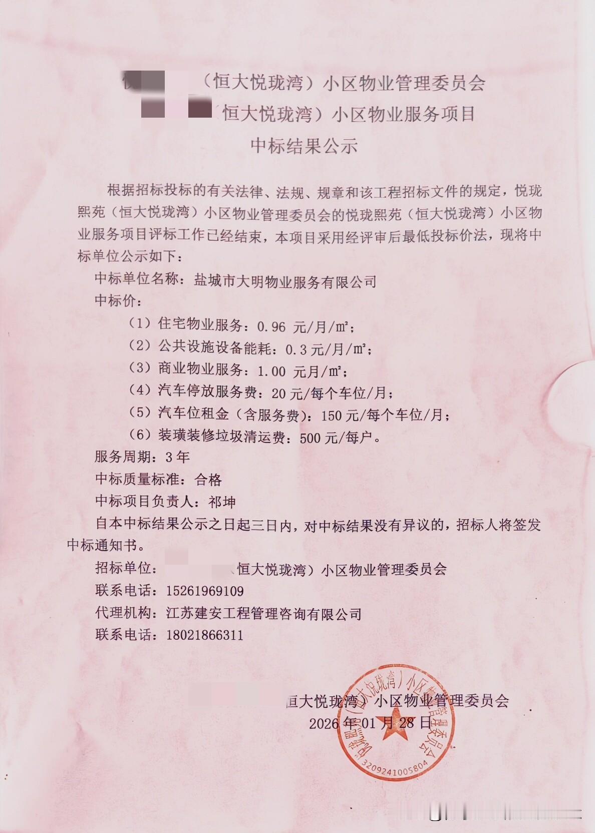 今天是金碧物业走后的第89天。 太恶心了,是谁把狗屎抛在了单元门口,而且抛了两堆。自己不打扫卫生,还恶心人,难道这就是用来迎接新的物业的到来,给他们一个下马威吗? 今天早上来了几十个人,涌进小区。带头大哥说,这是新物业来了,他们先做前期打扫卫生,打扫地下车库,也把每一层,每一个楼梯都打扫过去。 在每个单元也张贴了中标的告示,招标单位是我们小区的物业管理委员会,而不是前4次的村委会。 下午还有一家要到建筑垃圾在垃圾房前面的绿化在里面,南通六建的看门的大爷不让他倒,那个人说去找物业,但这时候去哪里找物业?物业还没有接手呢,过了一段时间,他趁看门大爷不在,又倒在了绿化带里。 新物业说从2月1日正式入驻,物业费是1.26元,比原来的1.43元便宜一点,按照我们县里的收费标准,4级服务费是0.8元,最多可以上浮20%就是0.96元。所以新物业公司是按照上浮的最高限度收取了物业费。