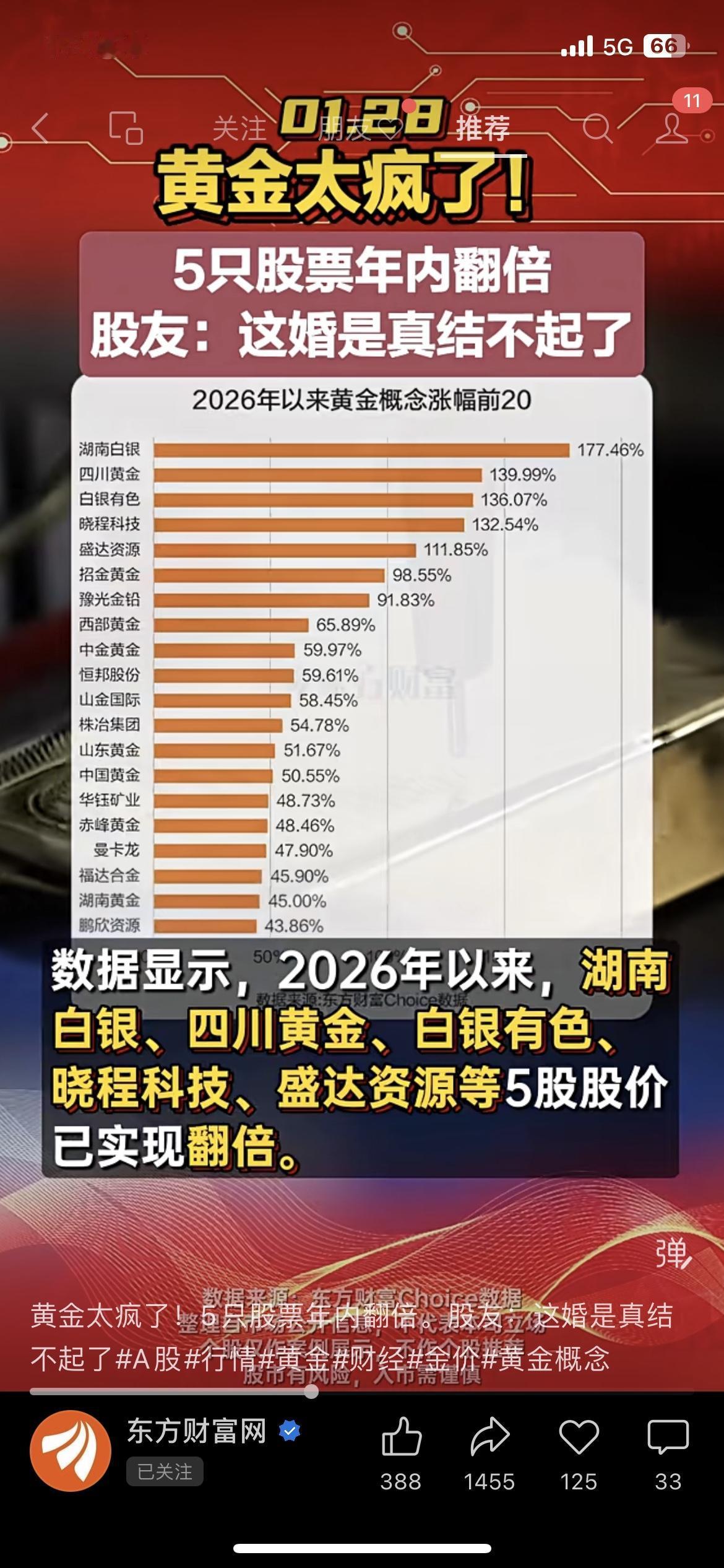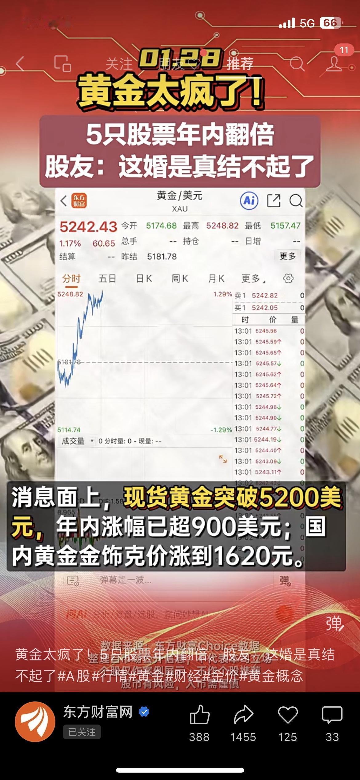 黄金疯了!现货黄金突破5200美元,国内金饰克价涨到1620块,A股黄金概念直接起飞,20只股票涨停,还有5只年内翻倍! 湖南白银、四川黄金这些个股今年涨幅超130%,中国黄金也走出4连板,网友都在吐槽:“金价涨成这样,婚都结不起了!” 不过专家也提醒,黄金短期涨幅过大,可能存在回调风险,别盲目追高。话说回来,你觉得这波黄金牛市还能持续吗?手里有没有黄金相关持仓? 评论区举个手,看看有多少人在这波行情里赚到了? 黄金疯涨 A股黄金概念 投资机会