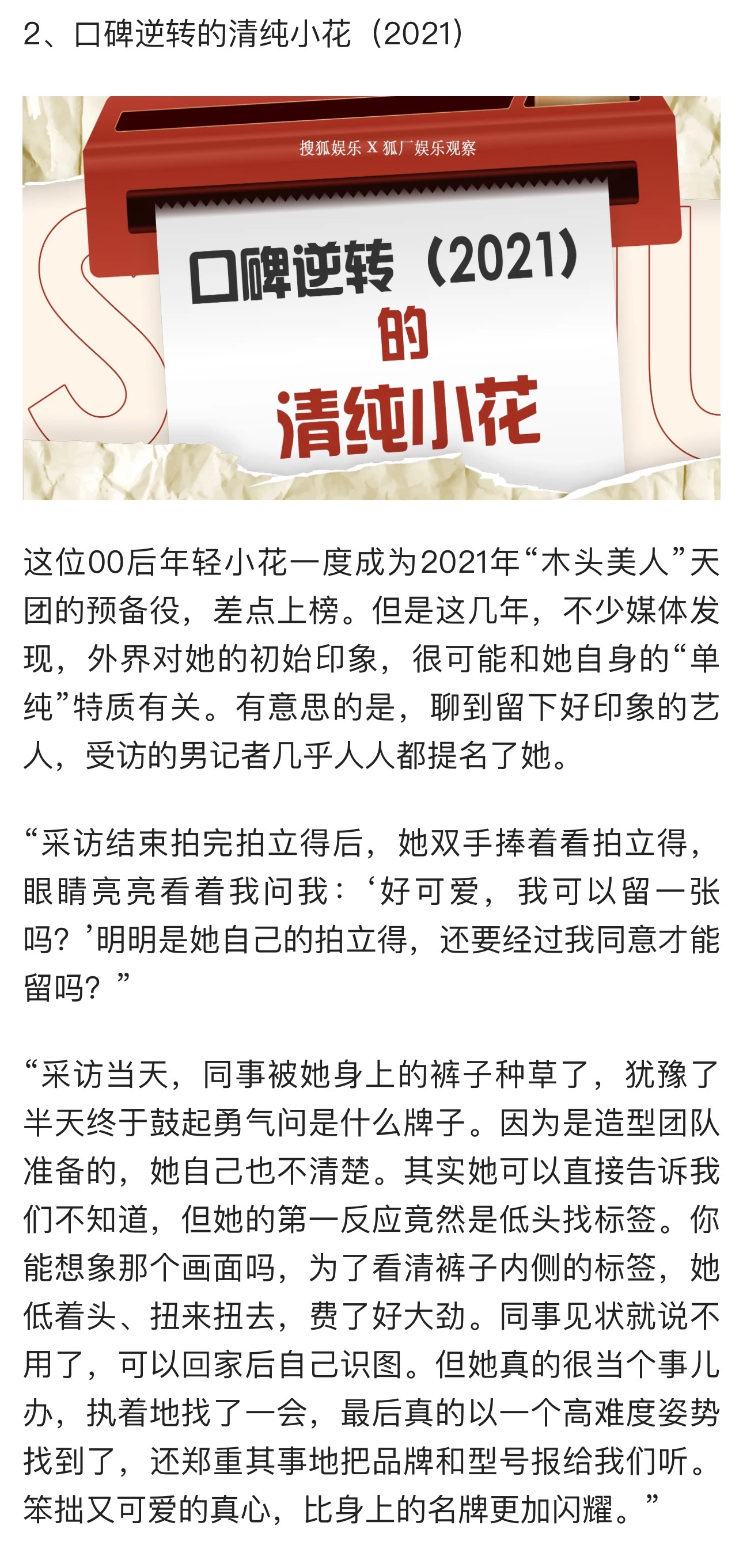 2025搜狐黑榜艺人🦊发了2025年的黑榜艺人,有三个🙊1️⃣ 将缩头坚持到底的古偶男主2025两部作品上线,但是对采访要求仍然过分苛刻的吐槽。不仅将缩头坚持到底,还将逐帧修改变成了“个人特色”。2️⃣ 傲慢不尊重人的罢工姐不尊重采访工作人员,提纲大删特删,媒体搞不懂为什么她突然口碑好转了:长得好看就能被原谅一切吗?”另外,还有剧组工作人员爆料她想罢工就罢工。3️⃣ 贯彻妈宝风格的大男主 私下依然容许“亲戚”随心所欲,对于宣传作品的采访工作也不上心。还会采访中途办一下私事,采访时打盹。搜狐发的2025口碑逆转艺人 除此之外,🦊还发了三个口碑逆转的艺人。1️⃣ 木头美人变撒娇妹宝(2021)2️⃣ 口碑逆转的清纯小花(2021)3️⃣幽默害羞体质华语歌手(2021)