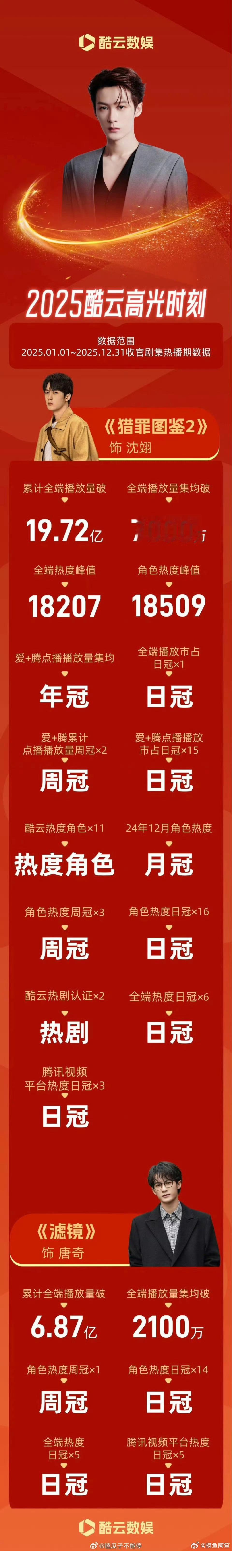 檀健次2025年酷云战报来了,《猎罪图鉴2》和《滤镜》都成绩不俗!非常成功的一年!