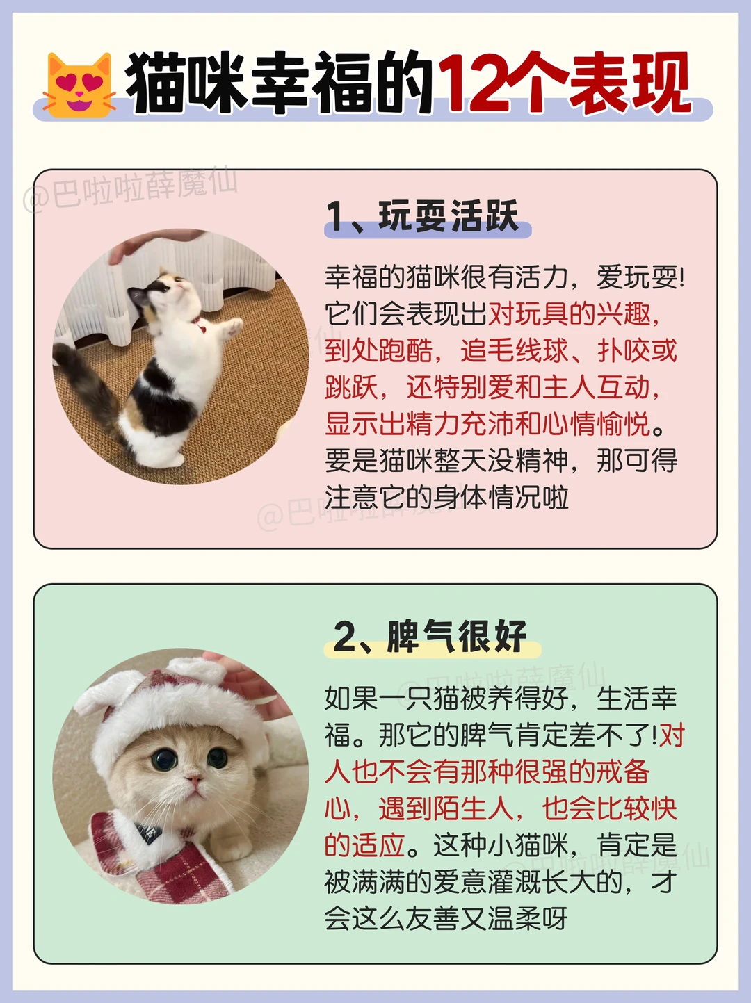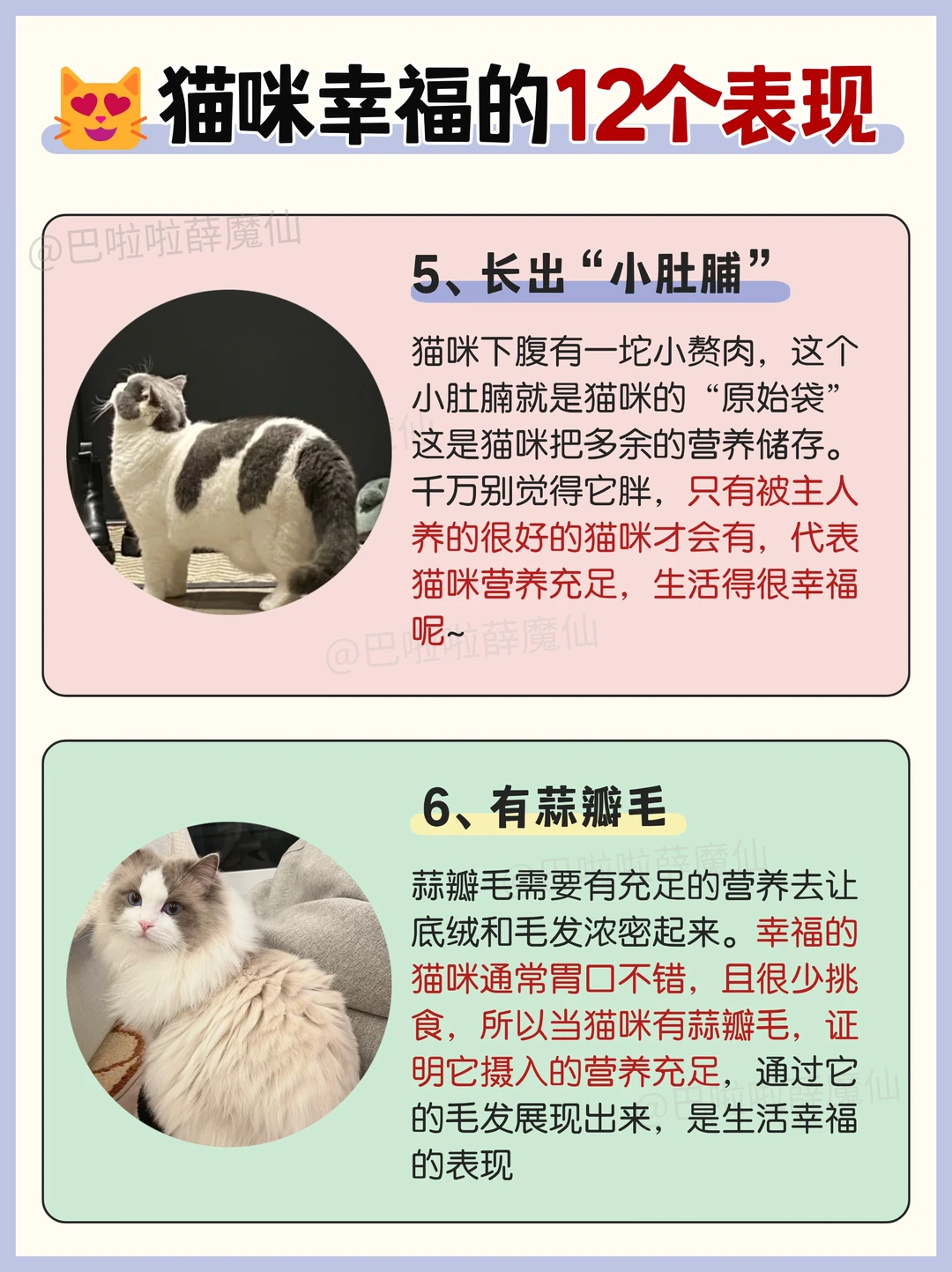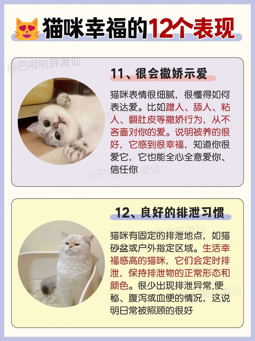 猫咪过得幸福时,通常会有以下12个表现👇快看看你家猫猫占了几条吧~ [一R]玩耍活跃 [二R]脾气很好 [三R]健康的外表 [四R]睡姿惬意 [五R]有小肚腩 [六R]有蒜瓣毛 [七R]竖着尾巴走路 [八R]精力充沛 [九R]胃口好不挑食 [一R][零R]在家跑酷 [一R][一R]会撒娇示爱 [一R][二R]不乱拉乱尿 [黄金薯R]如果你家猫咪全有这些,说明你真是个满分的铲屎官!猫咪跟着你太幸福了!