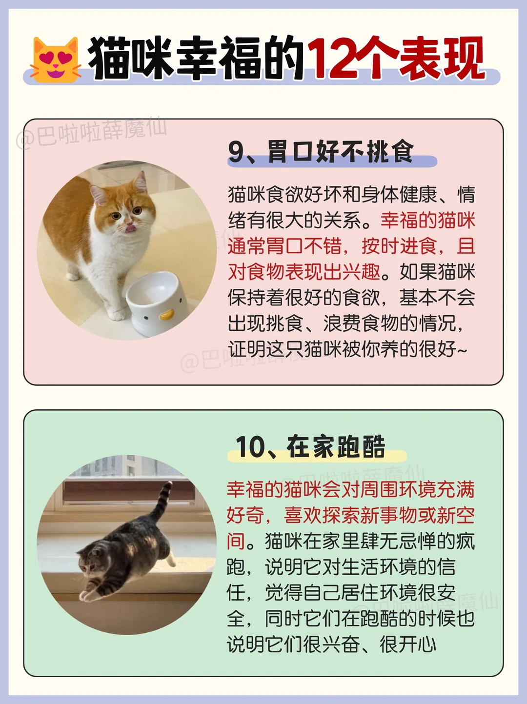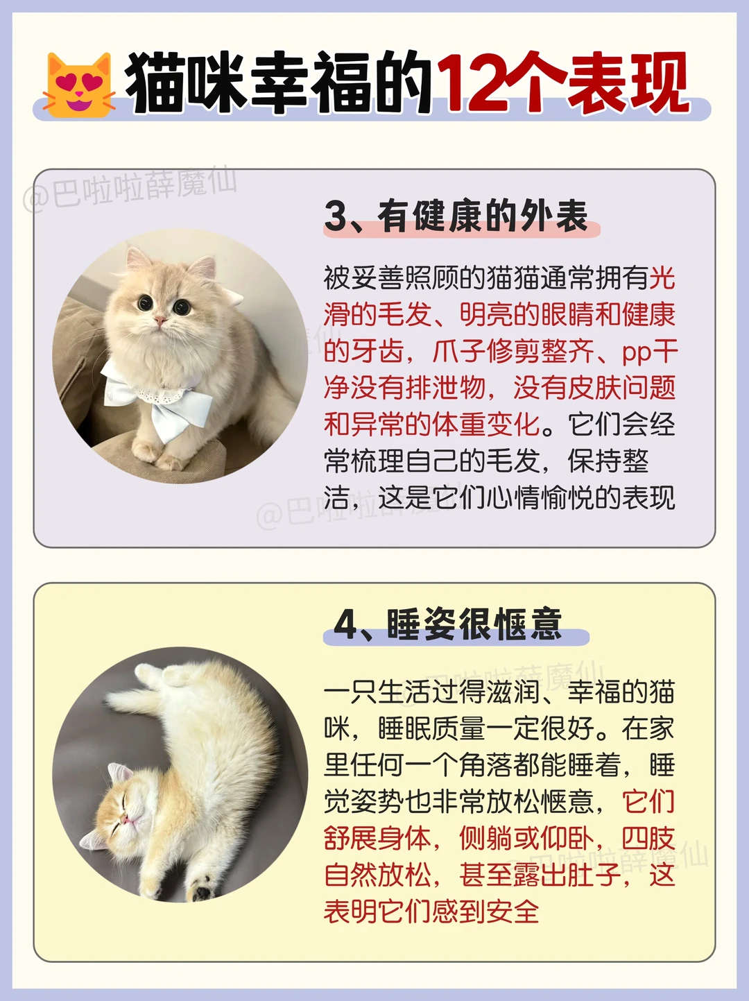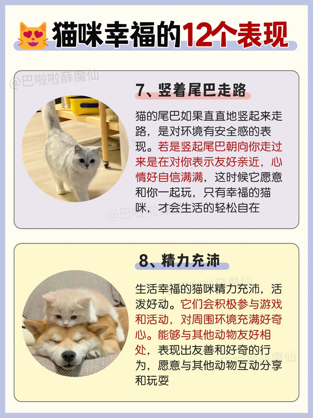 猫咪过得幸福时,通常会有以下12个表现👇快看看你家猫猫占了几条吧~ [一R]玩耍活跃 [二R]脾气很好 [三R]健康的外表 [四R]睡姿惬意 [五R]有小肚腩 [六R]有蒜瓣毛 [七R]竖着尾巴走路 [八R]精力充沛 [九R]胃口好不挑食 [一R][零R]在家跑酷 [一R][一R]会撒娇示爱 [一R][二R]不乱拉乱尿 [黄金薯R]如果你家猫咪全有这些,说明你真是个满分的铲屎官!猫咪跟着你太幸福了!