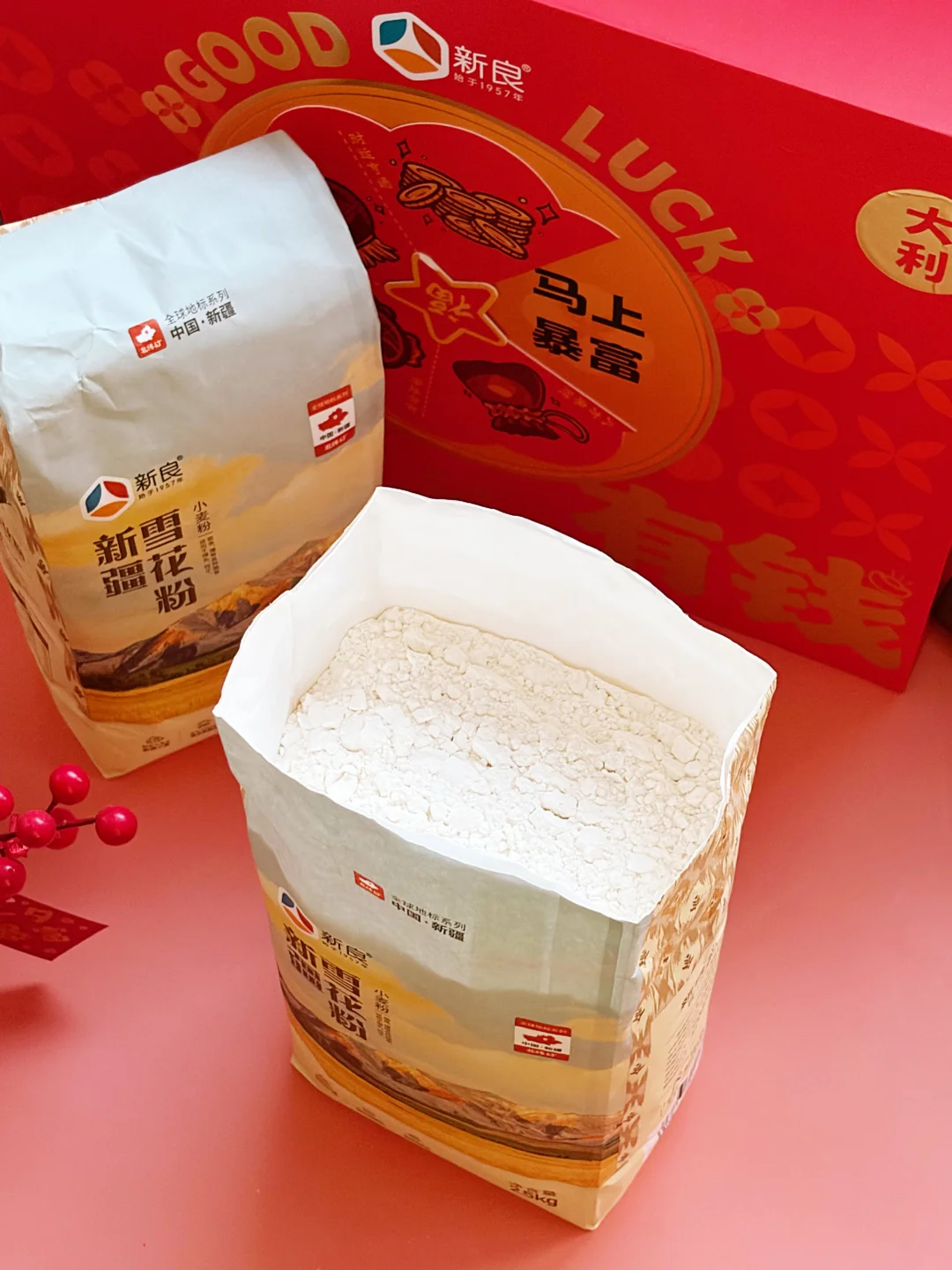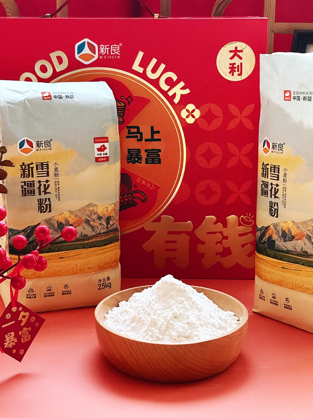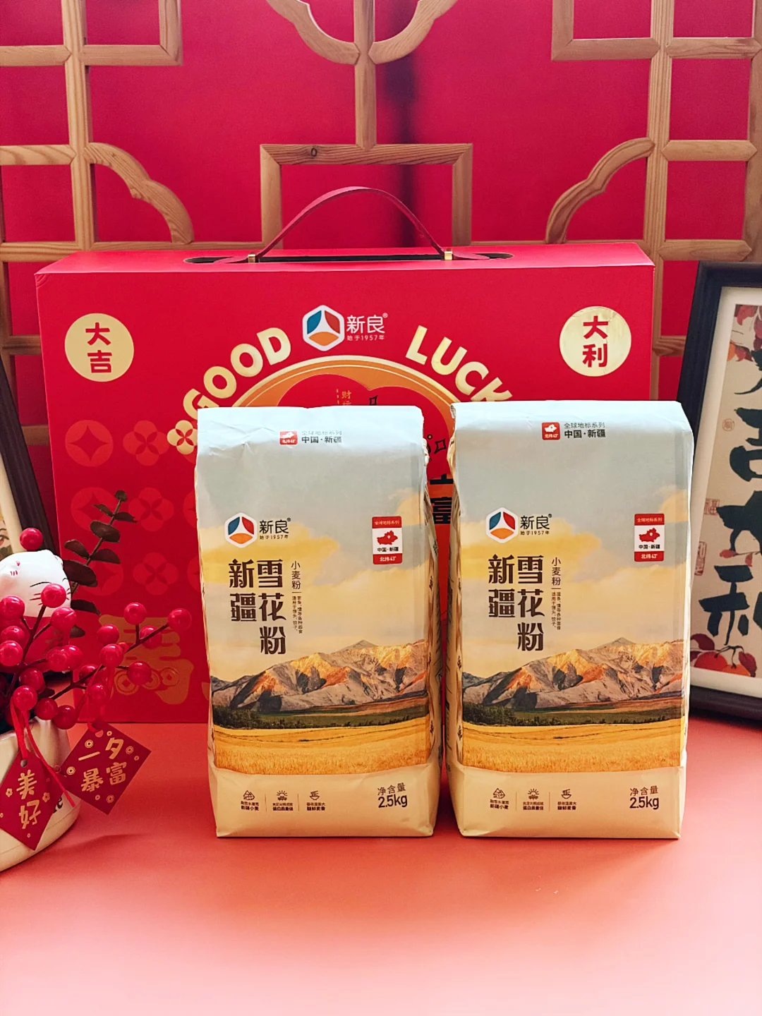 春节送礼选品难,烟酒茶点落俗套,保健品不实用,新良马上有钱年货礼盒真是及时雨。 新良新疆雪花粉马上有钱限定礼盒,颜值质感双在线。新疆天山雪水滋养的麦芯精粹,送的是地域好味,更是团圆心意。5KG礼盒分量充足,独立内袋方便拆分;礼盒高端大气年味足。新良是家庭烘焙行业领导品牌,不管送长辈、送亲友,都能拿得出手、吃得安心。