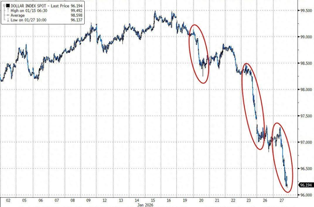 美元都跌到四年低谷了,特朗普还在那儿“淡定”地说:“美元表现很棒!” 这感觉就像自家房子着了火,主人却站在门口夸“这火光真温暖”… 不过仔细想想,他可能真不在乎——毕竟弱势美元有利于出口,还能变相稀释债务,这算盘打得太响了。 但市场可没他这么“乐观”,投资者被特朗普的政策不确定性搞得心惊胆战,从“格陵兰岛威胁”到“美联储政治化”,再到政府可能关门,一堆黑天鹅在天上飞。日元、欧元、新兴市场货币全在涨,美元指数却连跌四天,创下四年新低。有分析师甚至说,美元的风险溢价已经高到离谱,这哪是“波动”,简直是“自由落体”。 最魔幻的是,特朗普还暗示自己能像玩溜溜球一样操纵汇率… 这话听着霸气,却让全球交易员更慌了。毕竟,一个把美元当玩具的总统,谁敢放心持有?总之,美元这波跌势,恐怕不是“找到合理水平”那么简单,更像是美国信誉正在被市场重新定价。各位持有美元资产的朋友,要不要考虑… 换个姿势避险?