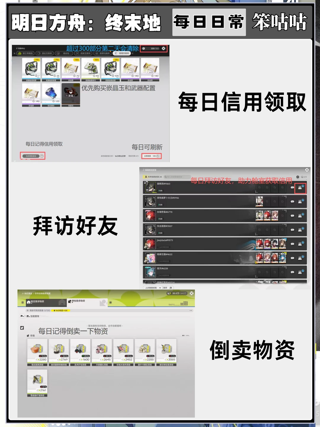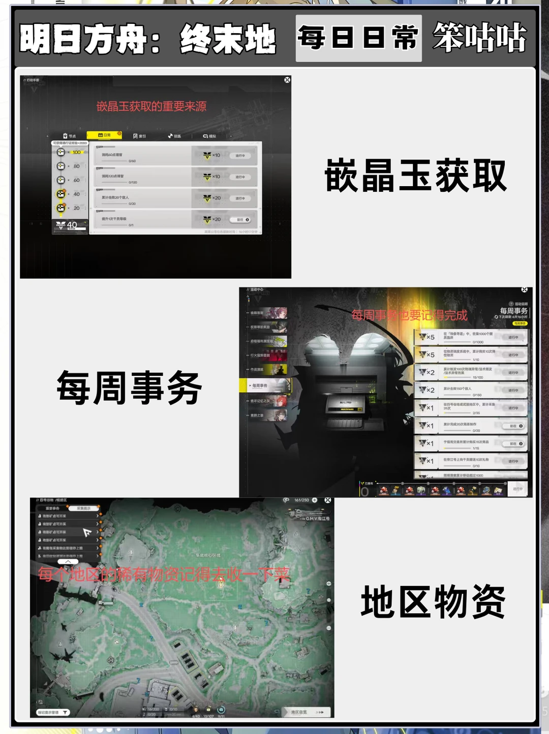 明日方舟终末地 终末地公测 明日方舟终末地攻略 塔卫二通讯 明日方舟终末地开放公测好几天了,这里给大家简单做了一下每日上线必做的日常清单,希望对小伙伴们的终末地游玩有所帮助! ------グッ!(๑•̀ㅂ•́)و✧------- 觉得有用的话一定要关关笨咕咕哦!好了,以上就是本期的全部内容。 ⭐制作不易,严禁任何商业性转载及搬运,转载需标注出处~ ⭐制作难免会有错漏,希望大家多多指出,我会及时修正喵~ ⭐祝大家都能十连双金!
