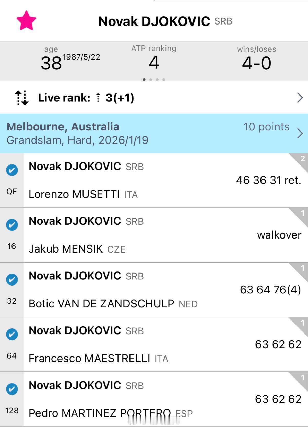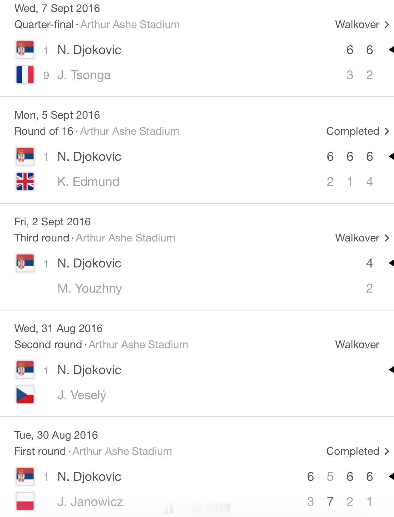 2026年澳网:德约科维奇前五场赢下九盘晋级四强一场不战而胜、一场0-2落后对手退赛2016年美网:德约科维奇前五场赢下八盘晋级四强一场不战而胜、一场首盘对手退赛,一场2-0对手退赛老父亲的本届澳网征程还会有幸运女神降临吗?德约科维奇晋级澳网男单四强澳网2026