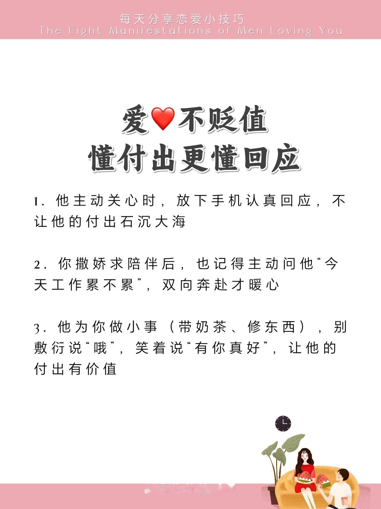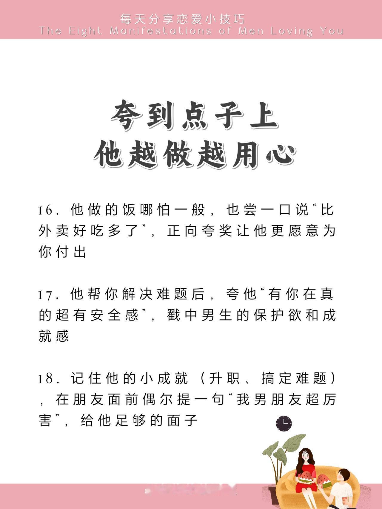 让男人越来越爱你❤️20个小技巧 为什么你的男友没有爱你,比你爱他的少? 明明你什么都付出了,他还无动于衷? 你掏心掏肺的对他好,他却从来不懂你? 原因是你一直在错误的方式,给男友提供错误的情绪价值,他get不到你的点,自然是爱的比你少 吃透相处底层逻辑,把爱意揉进日常,让男友越来越爱你,越用越上头的20个小技巧~ 这20个甜蜜小技巧你学会了吗? 赶紧行动起来,让他对你的爱➕🈵 ]我是韦依,每天分享恋爱小技巧,让你的爱情不迷路,以正确的方式恋爱,让你收获满满的爱。