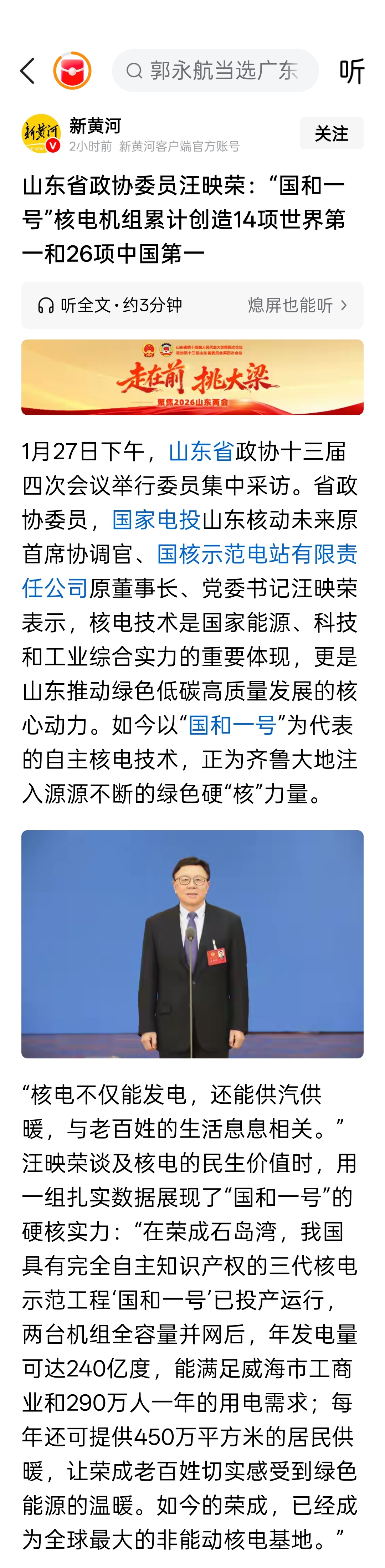 山东省政协委员汪映荣:“国和一号”核电机组累计创造14项世界第一和26项中国第一