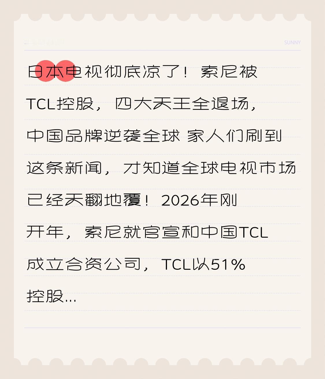 日本电视彻底凉了!索尼被TCL控股,四大天王全退场,中国品牌逆袭全球 家人们刷到这条新闻,才知道全球电视市场已经天翻地覆!2026年刚开年,索尼就官宣和中国TCL成立合资公司,TCL以51%控股接手索尼电视业务,曾经的“日本电子神话”彻底落幕,网友直呼:这波逆袭太提气了! 谁能想到,几十年前还垄断全球的日本电视,如今会落到“全军覆没”的境地?80年代那会儿,谁家要是有一台索尼特丽珑、松下彩电,那绝对是“万元户”的象征,亲戚朋友都得围着看。那时候的日本电视,凭借领先的CRT技术,亮度和色彩碾压同类产品,全球高端市场占比超40%,中国企业只能靠组装代工,核心部件100%依赖进口。 可风水轮流转,日本电视的衰落,早已埋下伏笔!21世纪初,全球电视开始向轻薄的液晶技术转型,可日本厂商却集体犯了致命错误:松下豪赌等离子,索尼死守CRT技术,都觉得液晶只是“过渡技术”。反观韩国三星、LG果断all in液晶,中国企业也趁机发力——合肥拿出当年财政收入三分之一支持京东方,TCL斥资245亿建面板厂,硬生生打破了“缺芯少屏”的困境。 等日本企业反应过来时,早已错失最佳窗口期!2013年松下宣布退出等离子业务,此时液晶电视全球份额已超80%;夏普2016年被富士康收购,东芝2017年把电视业务卖给海信,日立、三菱陆续停售电视,曾经的“四大天王”只剩下索尼苦苦支撑。可索尼电视业务也连续13年亏损,只能不断出售工厂、缩减规模,最终还是选择“断臂求生”。 而中国品牌的崛起,靠的可不是运气!TCL如今全球每卖出两台Mini LED电视,就有一台是它家的,专利数量行业第一;海信在激光电视领域独占鳌头,技术领先全球;京东方的面板产能更是稳居世界前列,让中国电视彻底摆脱了对进口屏的依赖。2025年全球电视出货量前十,中国品牌占了5席,索尼仅以1.9%的市占率勉强垫底,日本电视只剩“索尼”一个空壳。 更解气的是,中国电视不仅在全球市场杀疯了,还反攻日本本土!现在日本市场近半份额被中国品牌占据,TCL、海信靠着快速迭代和精准适配,3个月就能推出符合日本能效标准的新品,而日本企业往往需要6个月以上。曾经让中国人追捧的“日本制造”,如今在自家市场被中国品牌按在地上摩擦。 这场逆袭,藏着中国制造业的二十年磨一剑!从当年被外企打压、技术封锁,到如今掌握核心技术、主导全球市场,中国电视的崛起,正是中国制造业转型升级的缩影。没有永远的王者,只有顺应时代的创新者,日本电视的衰落告诉我们:固守过去的优势,终将被时代淘汰。 如今,TCL控股索尼电视后,全球市场将形成中韩争霸的格局,中国品牌冲击“全球第一”指日可待。这不仅是一场商业胜利,更是中国技术实力的最好证明。评论区聊聊,你家现在用的是哪个品牌的电视?有没有见证过中国家电的崛起?点赞转发,让更多人知道这份属于中国制造业的骄傲!