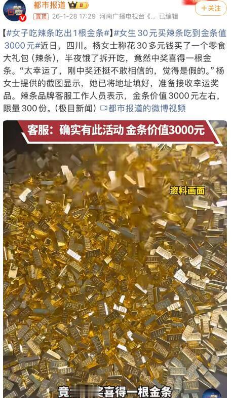 全网最幸运的人出现了, 她就是四川的杨女士。 不过是吃了1口辣条,就中了1根价值3000元的金条。 杨女士说:“刚中奖时,还不敢相信,觉得是假的。” 我也是这样认为的。 想想这件事有多么离谱, 只是花了30多元,买了一个辣条零食大礼包,就吃出价值3000元的金条。 这件事怎么看,怎么假。 不过,后来辣条品牌客服工作人员出来证明了。 杨女士中奖是真的,辣条零食大礼包有金条也是真的。 不过,限量300份。 也不知道又有哪些幸运的人,要因此而发财了。 不过,我觉得, 从今天开始,辣条的销量估计得上涨好几个百分比。 如果吃辣条能中金条, 你会买吗?