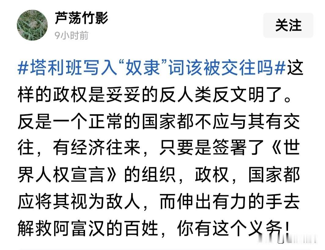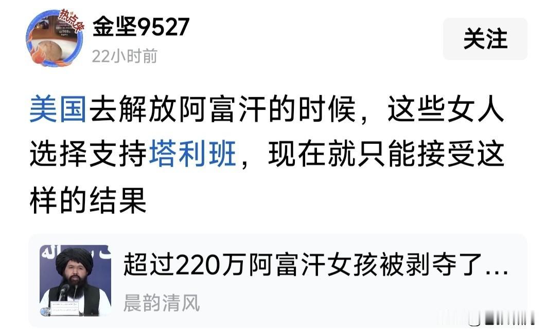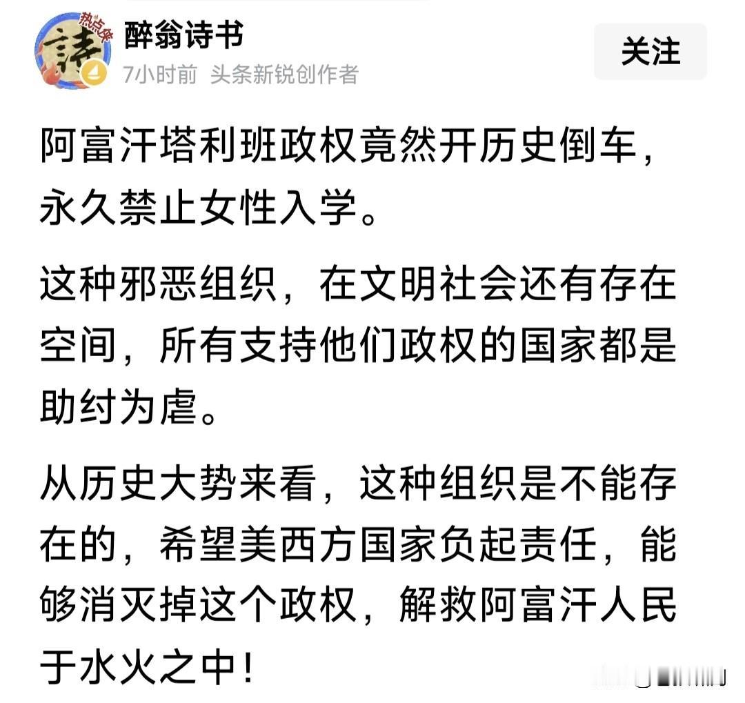 惊闻塔利班颁布新法典,竟禁止妇女与女童入学,220万女性失去受教育权利!还把社会分成“自由人”与“奴隶”两大群体,真是让人惊掉下巴! 这是一个什么社会?记得胡适先生曾说过:衡量一个国家是否文明,只看三件事就知道了:如何对待儿童?如何对待女性?如何利用闲暇时间? 塔利班控制下的阿富汗,前两条都占全了!第三条估计也一样。这是一个什么政权?这种政权控制下的国家,能融入文明世界,搞好人民生活吗? 有网友发文,怒斥塔利班倒行逆施,批评支持他们上台的这些受害的女性:你们的选择对得起遭受的苦难! 有网友希望:世界文明国家负起责任,共同努力铲除这个邪恶政权,把阿富汗人民从水深火热中解救出来! 有网友呼吁:凡是签署“世界人权宣言”的国家与组织,都应以此政权为敌,解救那里的人民,你有这个责任! 苍狼赞同网友言论!当今世界文明潮流之下,竟然还有这样的政权?还有这样的法律?还有如此把女性不当“人”的事情发生?应该遭天谴人诛啊! …………